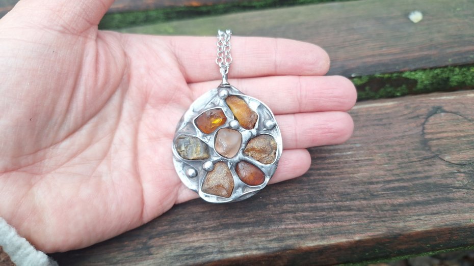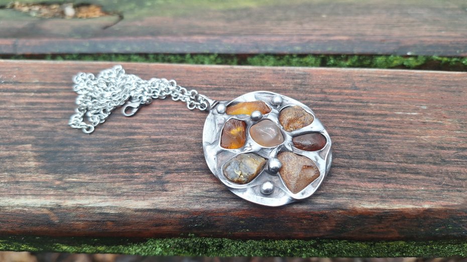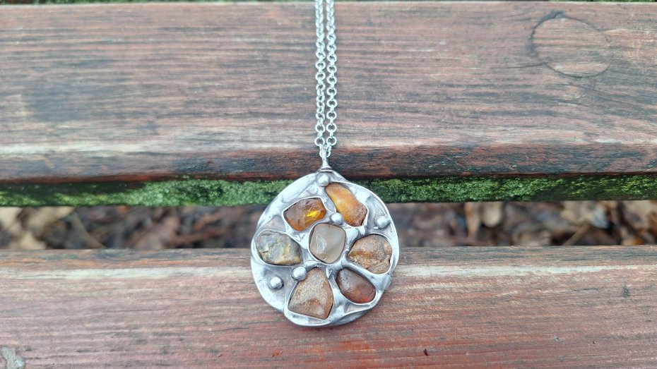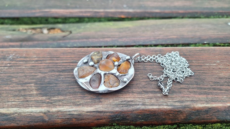 Wisiorek wykonany z miedzi, cyny i bursztynów. Wymiary ok. 4.5 na 4.5 cm. Zawieszony na łańcuszku o długości ok. 50 cm.