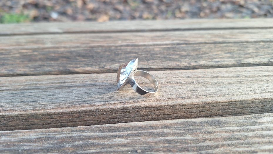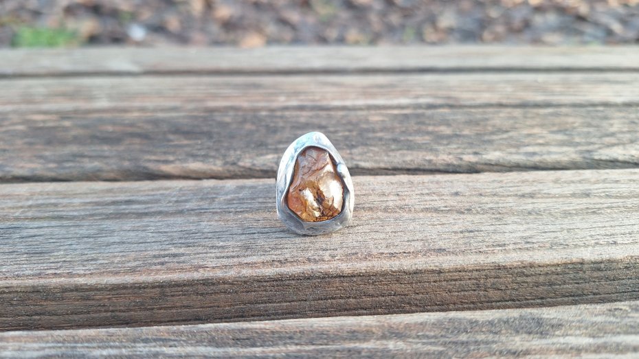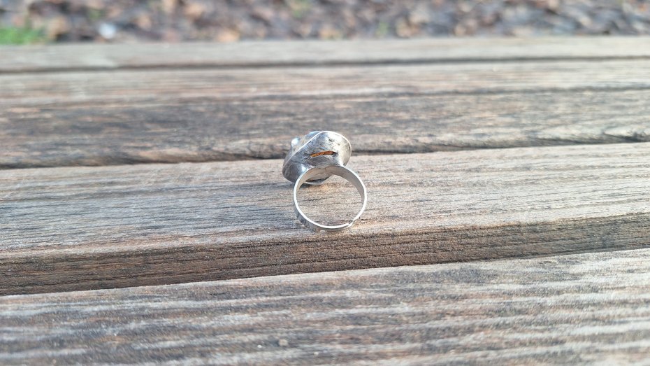 Pierścionek wykonany z miedzi, cyny i bursztynu. Wymiary ok. 2.2 na 1.7 cm. Regulowany. Nie jest ciężki.