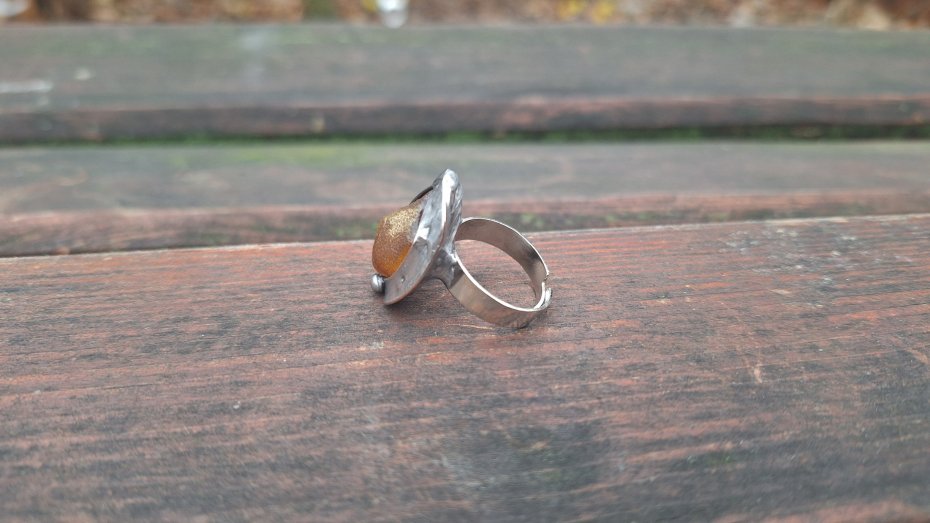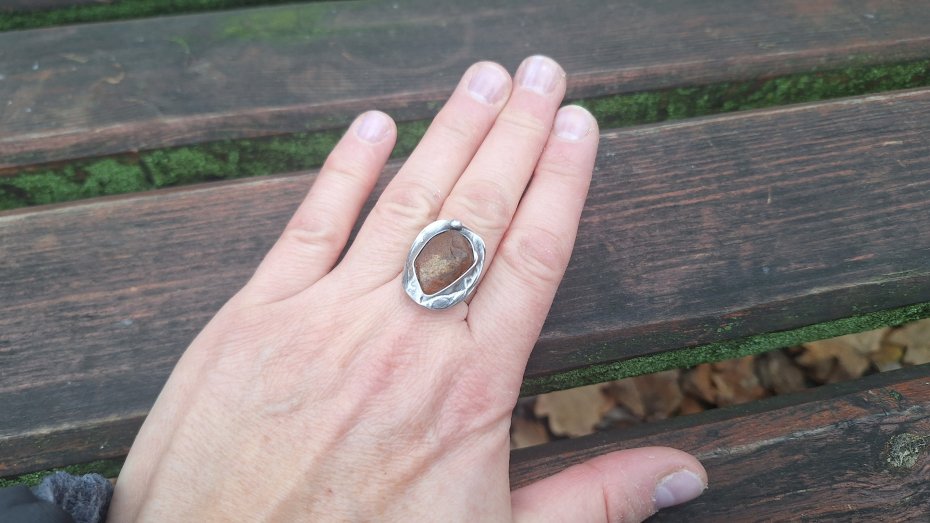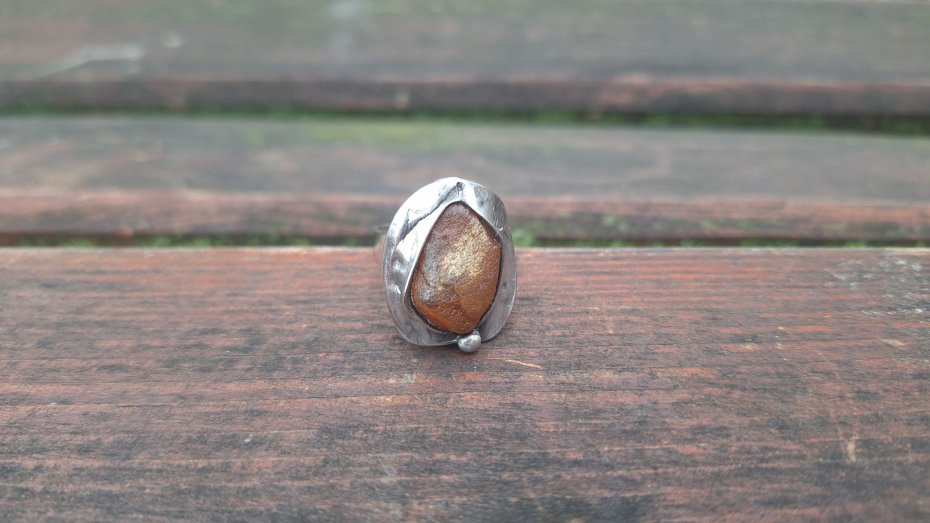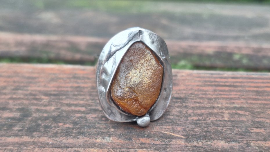 Pierścionek wykonany z miedzi, cyny i bursztynu. Wymiary ok. 2 na 1.7 cm. Regulowany. Nie jest ciężki.