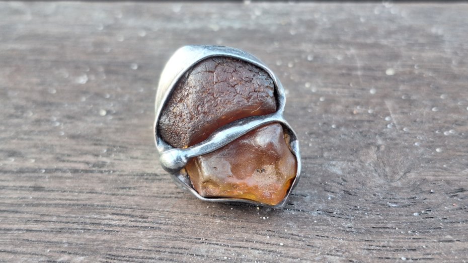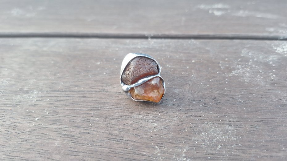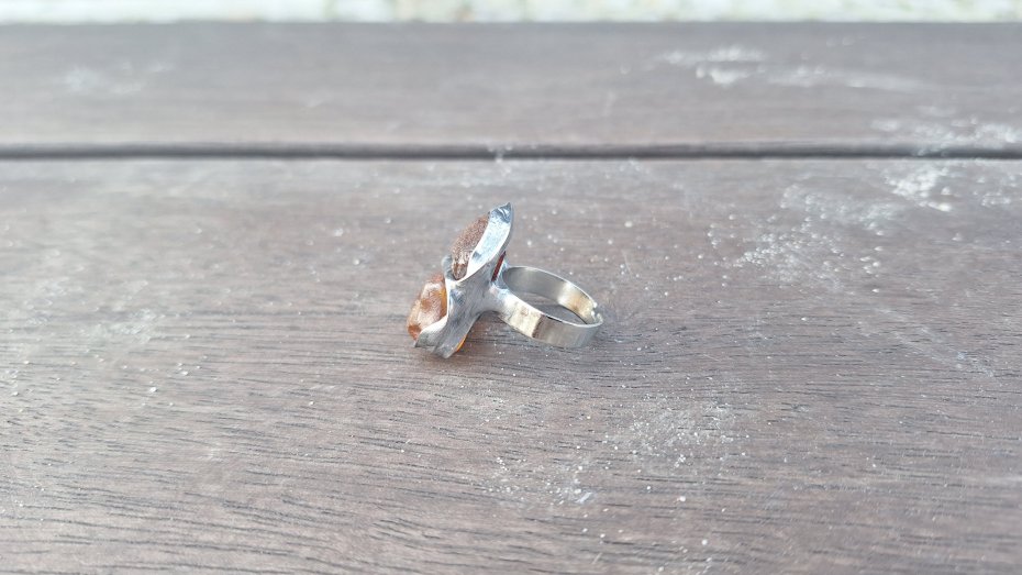 Pierścionek wykonany z miedzi, cyny i bursztynów. Wymiary ok. 2.5 na 2 cm. Regulowany. Nie jest ciężki.