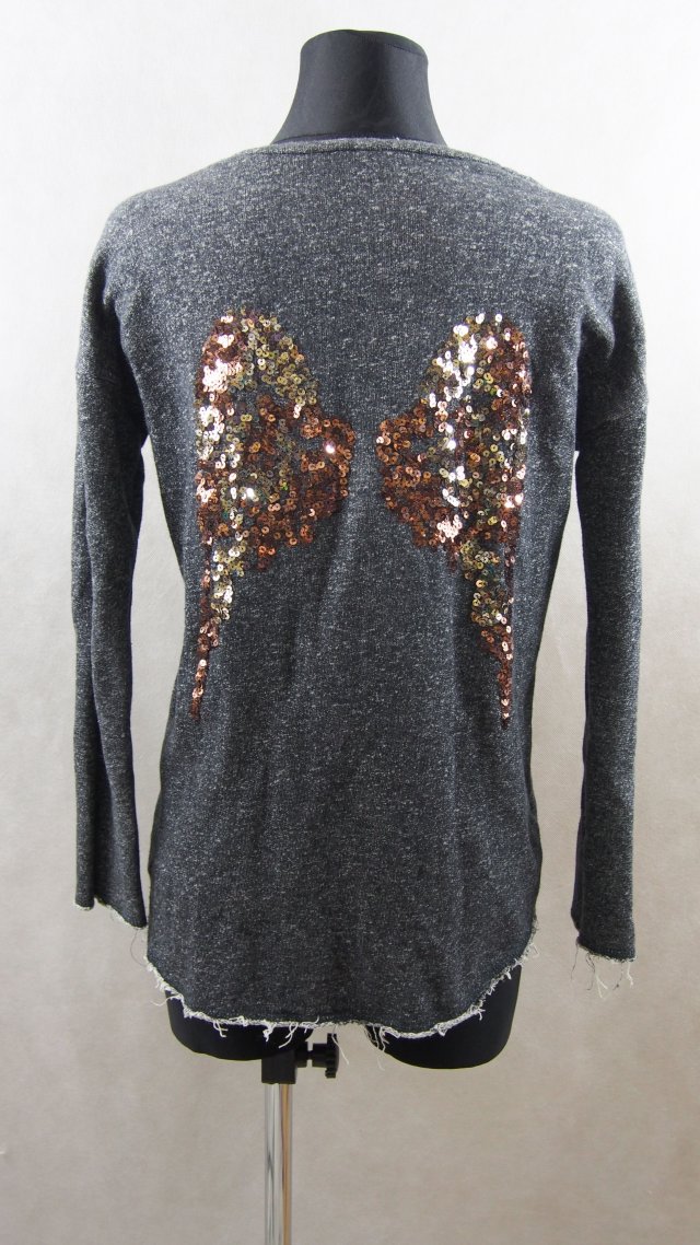 Szara bluza o surowym wykończeniu z cekinowymi czarno złotymi skrzydłami. Bluza oversizowa, z przedłużonym tyłem. Materiał; 100% bawełna. Od Giny Tricot.