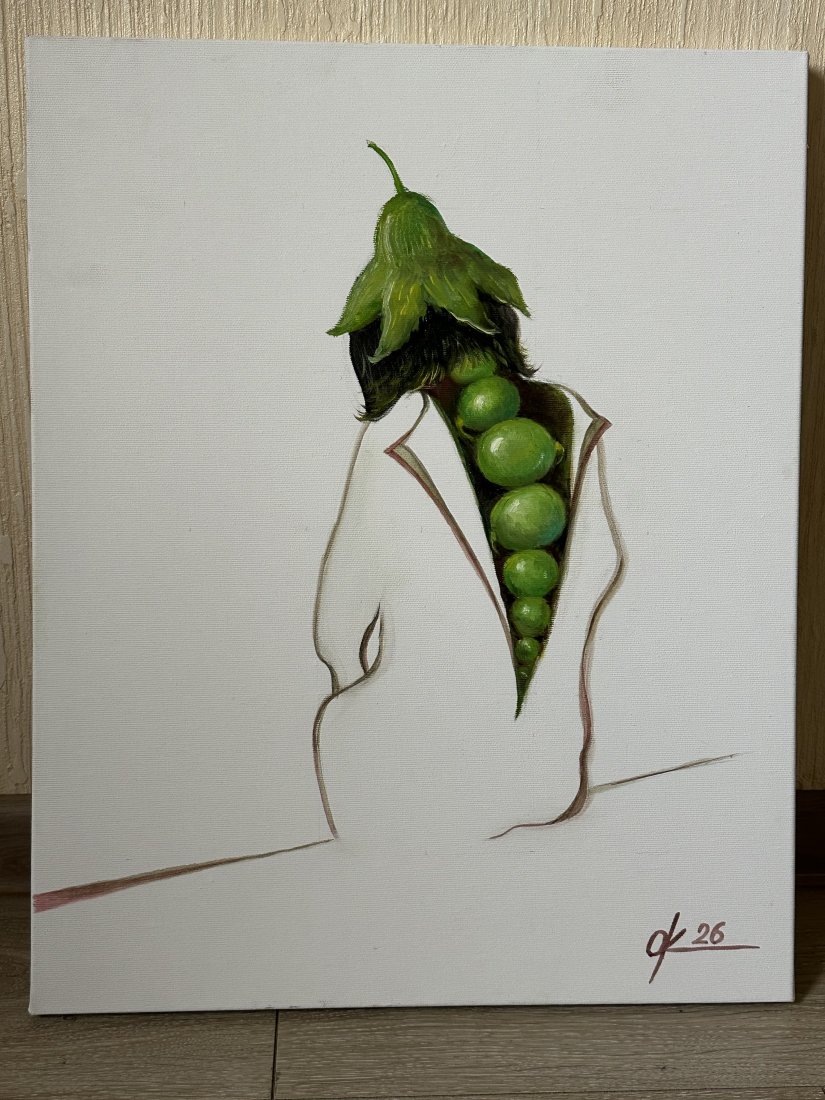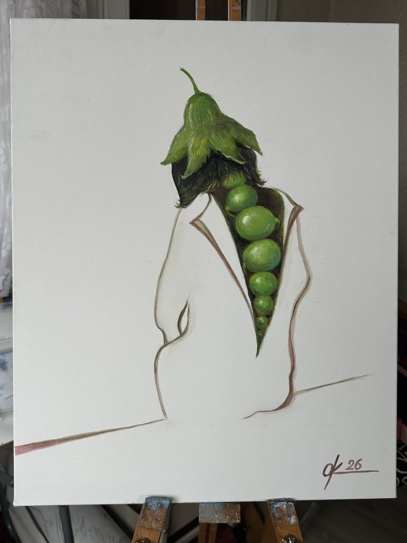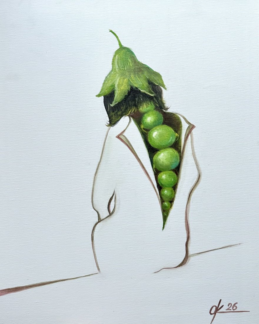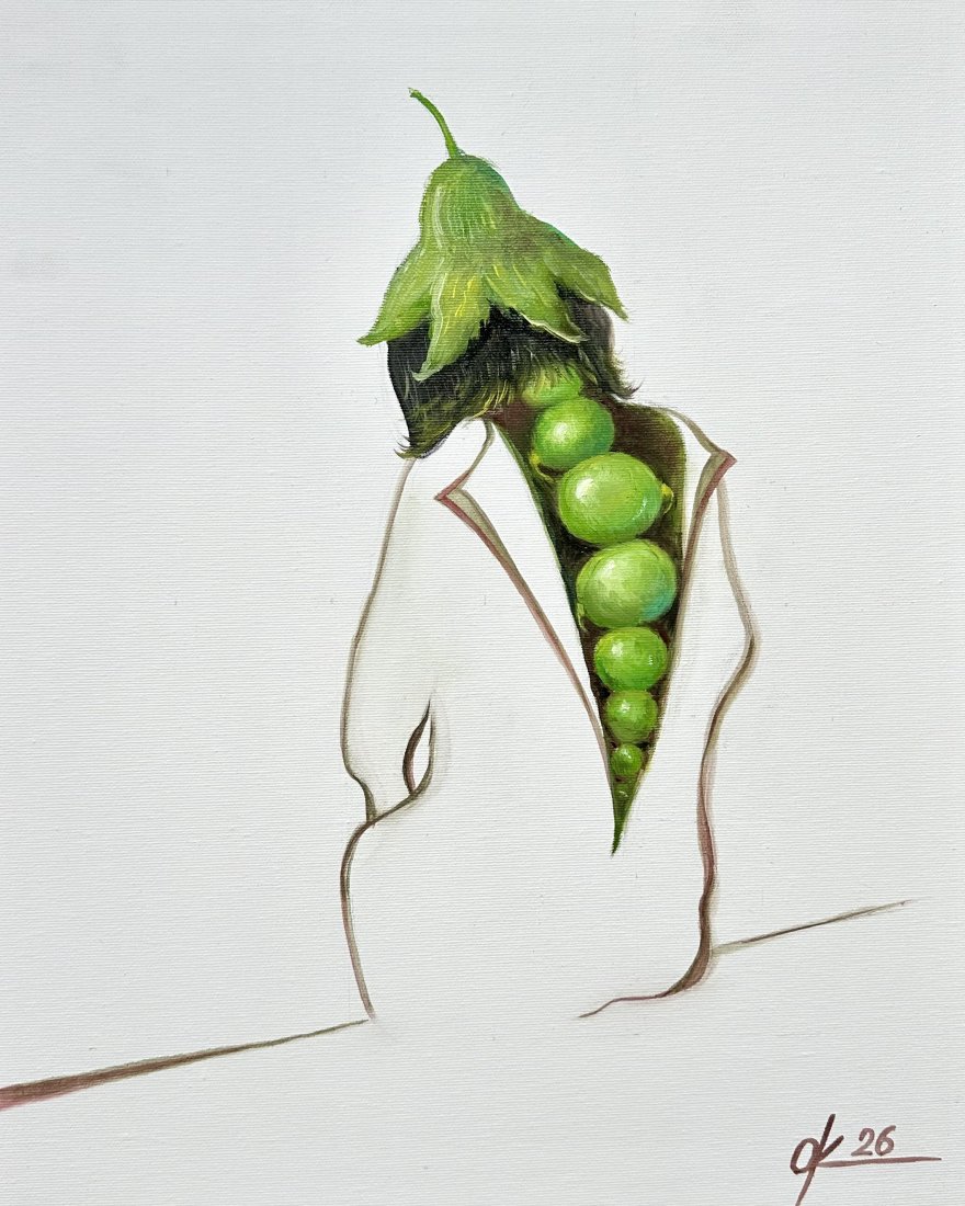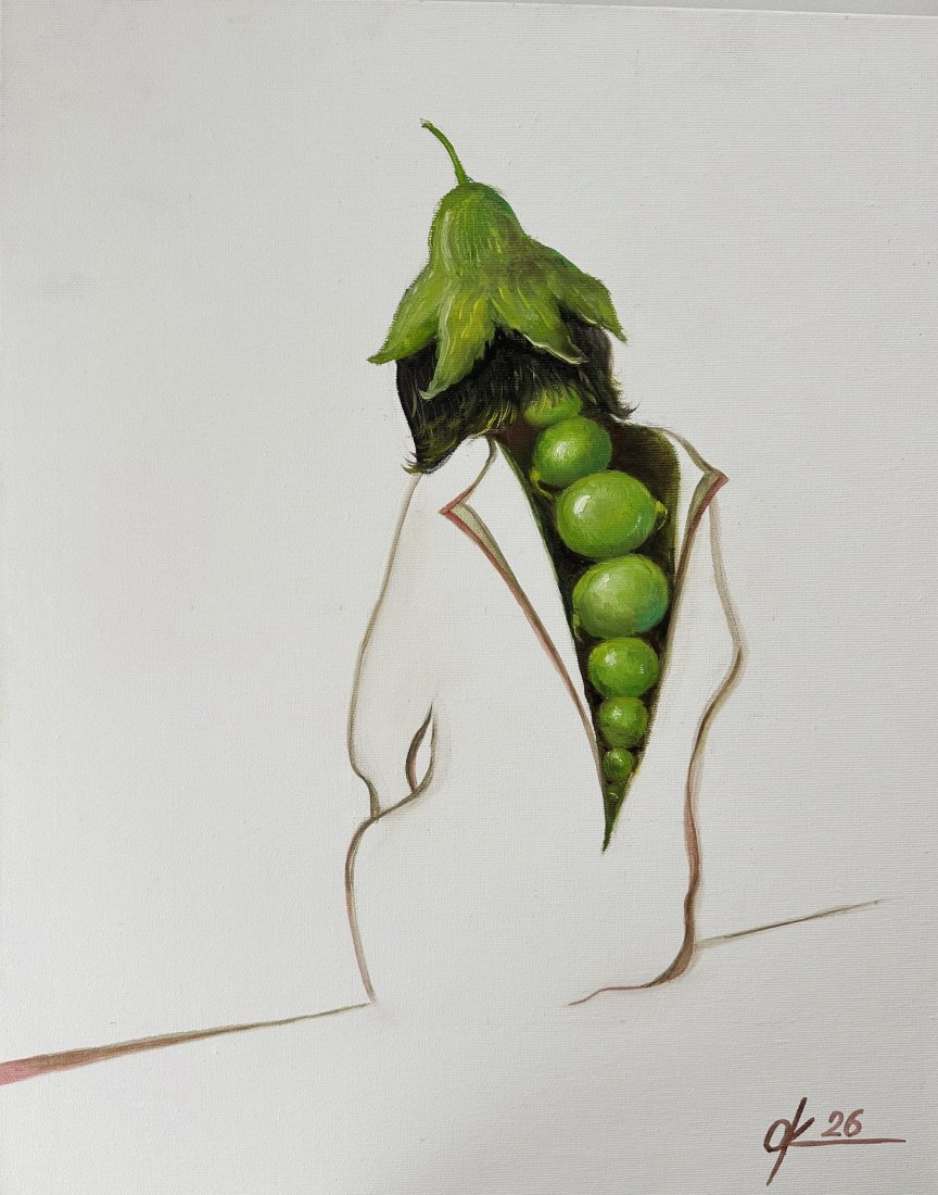Ten oryginalny obraz olejny to uderzająca, surrealistyczna kompozycja, w której postać ludzka łączy się z organicznymi, botanicznymi elementami. Modelka, ubrana w minimalistyczną, białą sylwetkę, odsłania nieoczekiwany, wewnętrzny świat – pionową kompozycję żywych, zielonych owoców, promieniujących życiem i kontrastem.