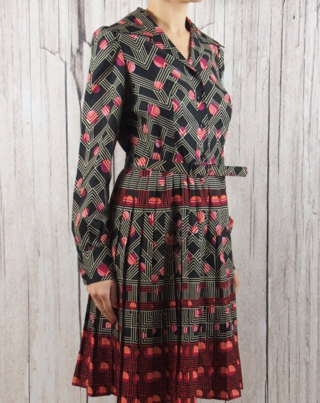 Sukienka z lat 70-tych. Projektu Susan Barry. Materiał: trudno jednoznacznie określić - poliester lub nylon.
