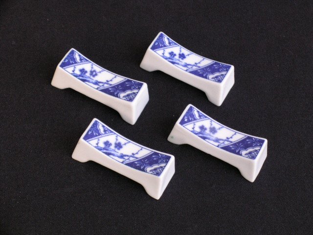 Cztery porcelanowe podstawki pod pałeczki - element niezbędnika przy celebracji sushi. Kobaltowy nadruk i błyszczące szkliwienie. Wyglądają na nie używane. 5 x 2 x 2 cm. Stan bardzo dobry.