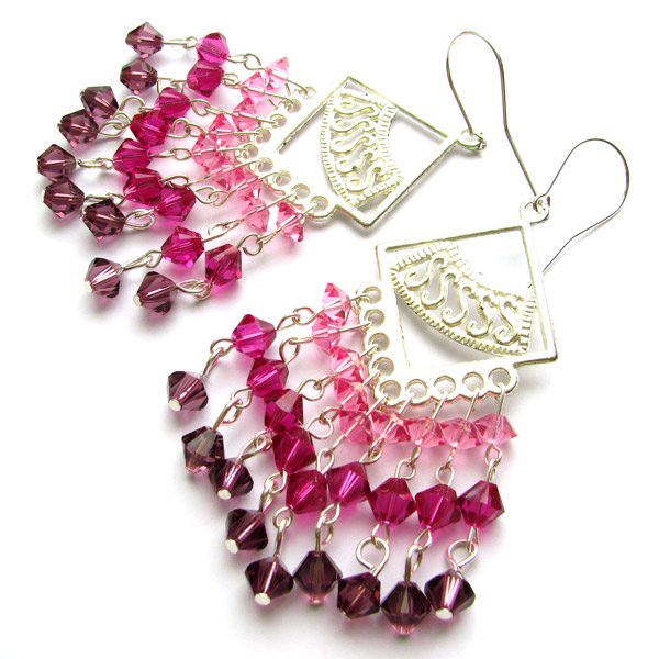 Kolczyki wykonane w całości z kryształków Swarovski Crystallized w kolorze różu, fuksji i fioletu (diamentowe i briolette). Metalowe zawieszki i srebrne bigle. Długość kolczyków bez bigli 7 cm.