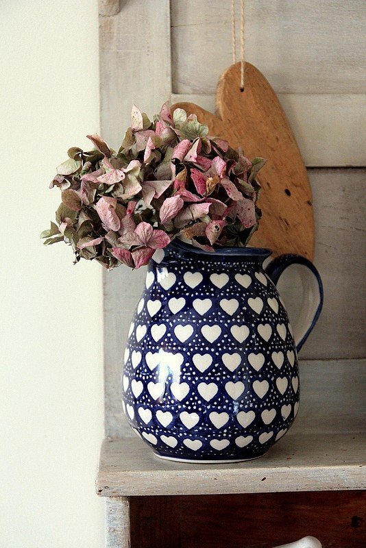 Uroczy dzbanek granatowy w urocze białe serduszka.