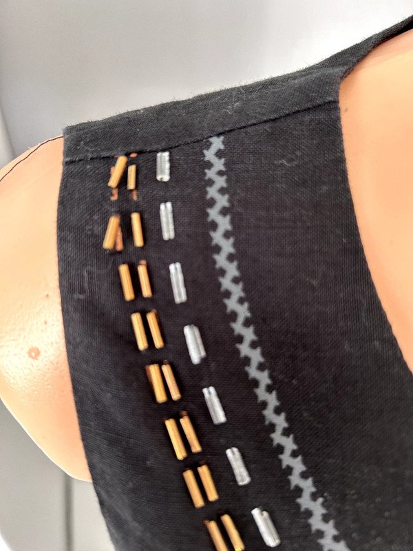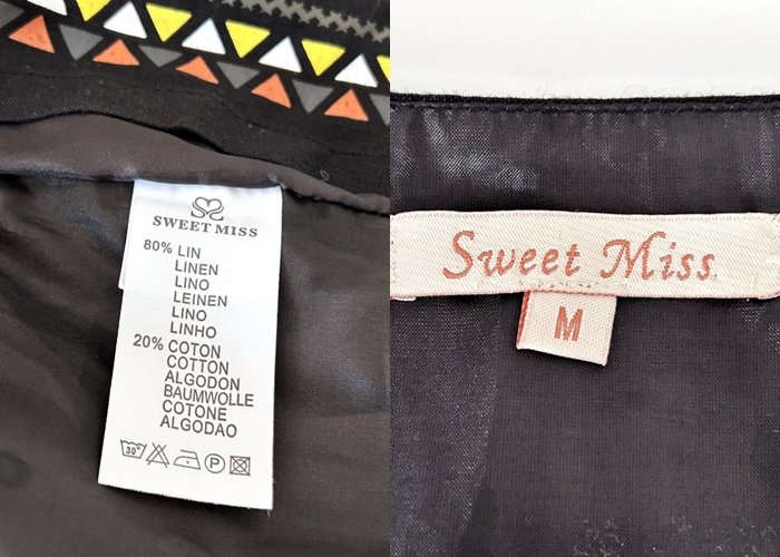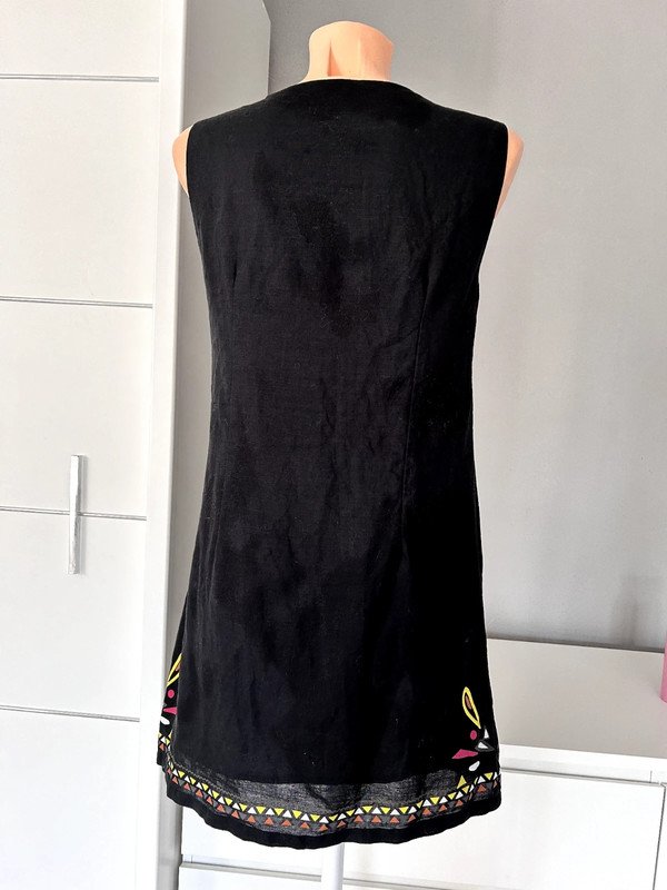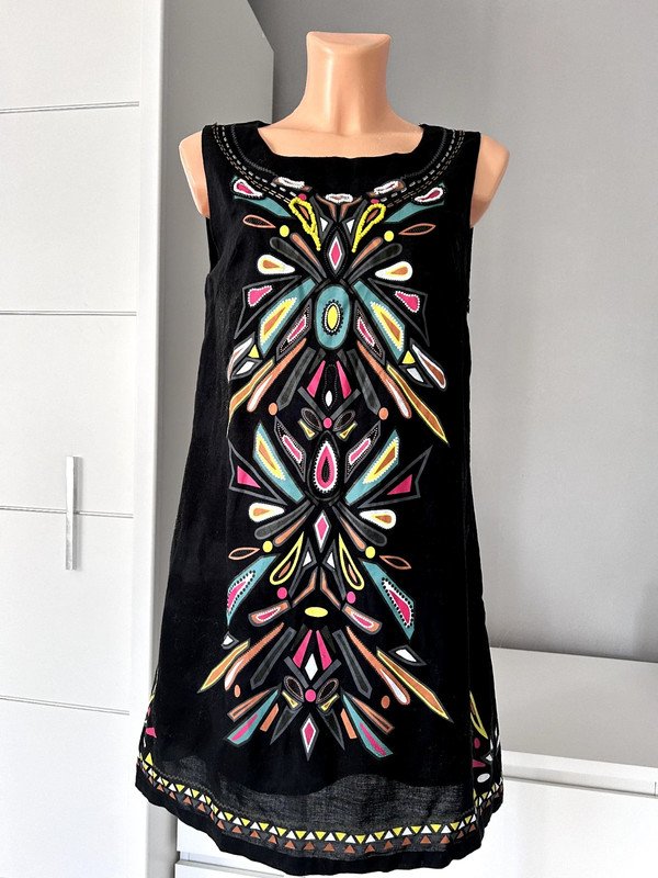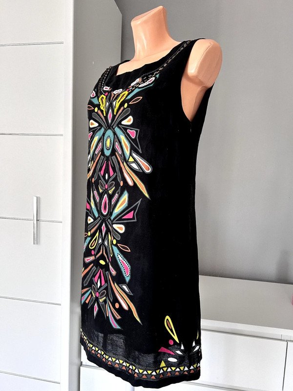 Sukienka czarna z naturalnym składem 80 % len, 20 % bawełna, firmy Sweet Miss, rozmiar M 38. Z etnicznym wzorem, na podszewce, klasyczny krój, dopasowana z zamkiem z boku, dekolt łódka. Oryginalna I niespotykana, w niej nie przejdziesz niezauważona. Polecam
