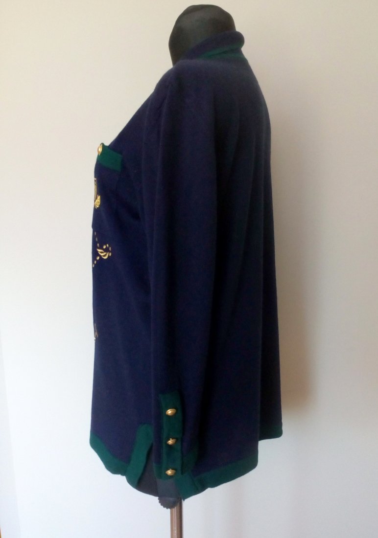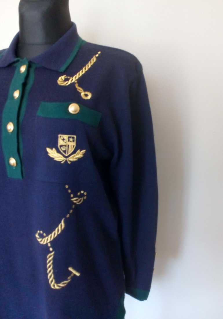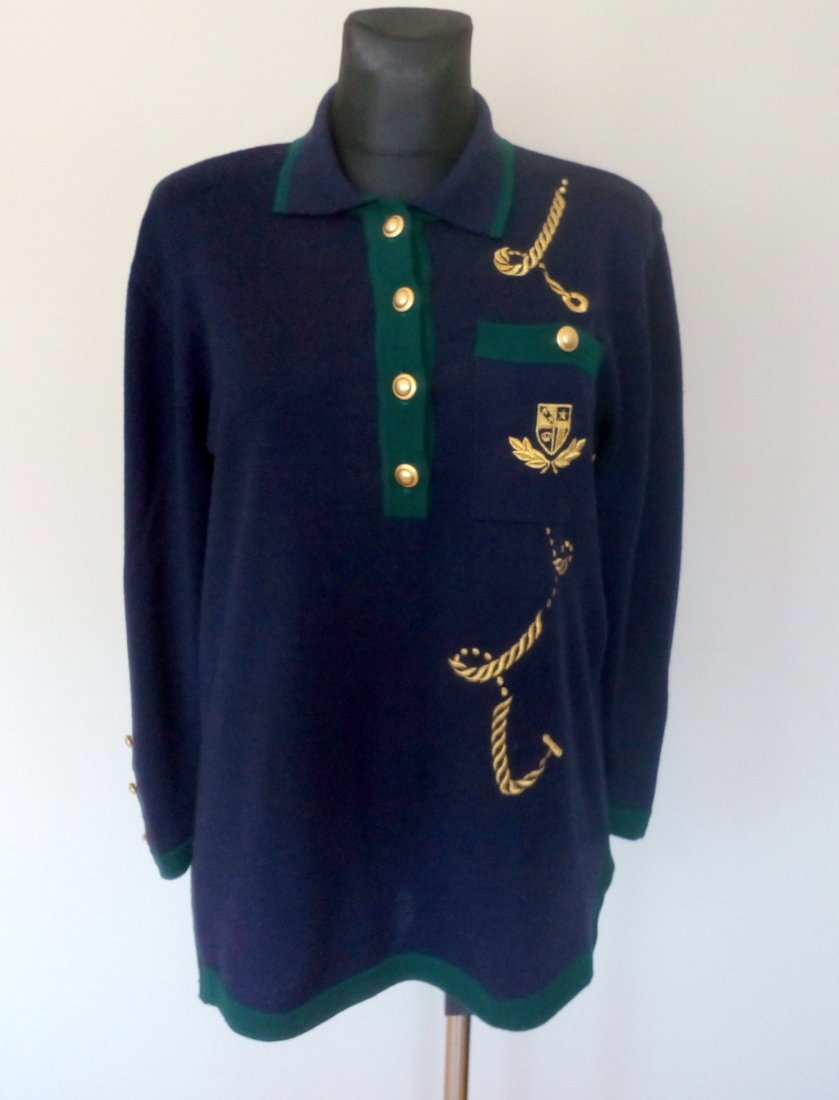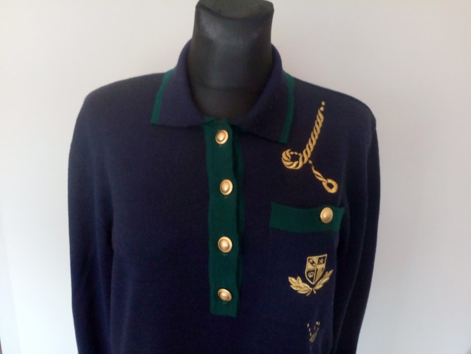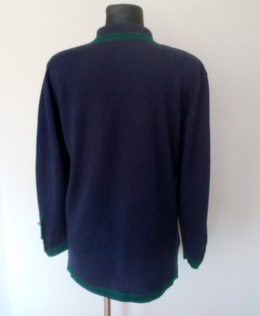 Granatowy sweter z dużym udziałem wełny, zdobiony złotym haftem i guzikami, lamówki w kolorze ciemnej zieleni, po bokach rozcinany, na lewj piersi nazywana kieszeń, u dołu przodu zaszyta mała dziurka