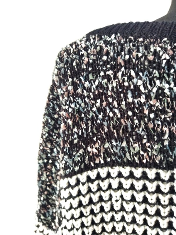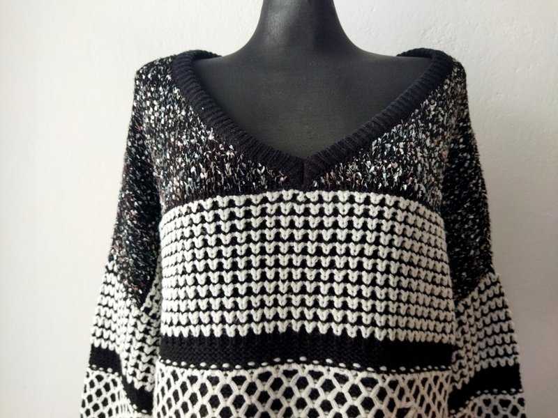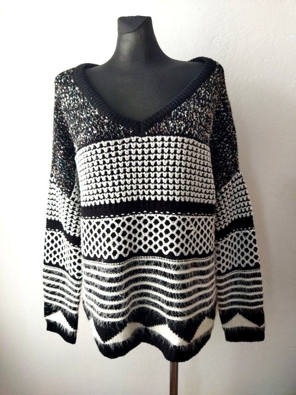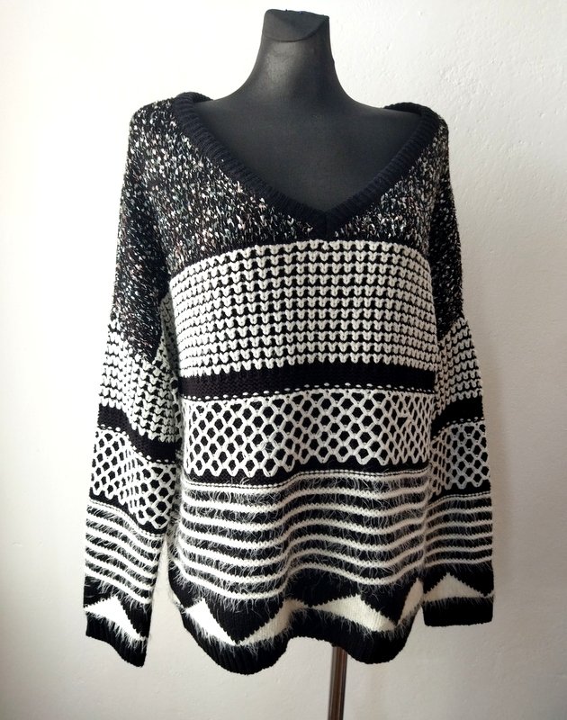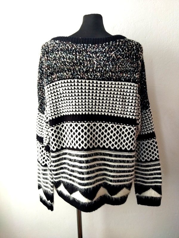 Sweter w biało-czarnej kolorystyce z akrylowej włóczki, którego głównym atutem jest różnorodność splotów . Z dekoltem w szpic, z niżej doszywanymi rękawami. Wykończony ściągaczami. Miły podatny i rozciągliwy