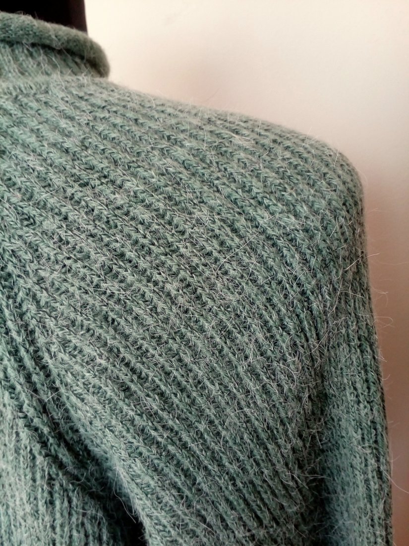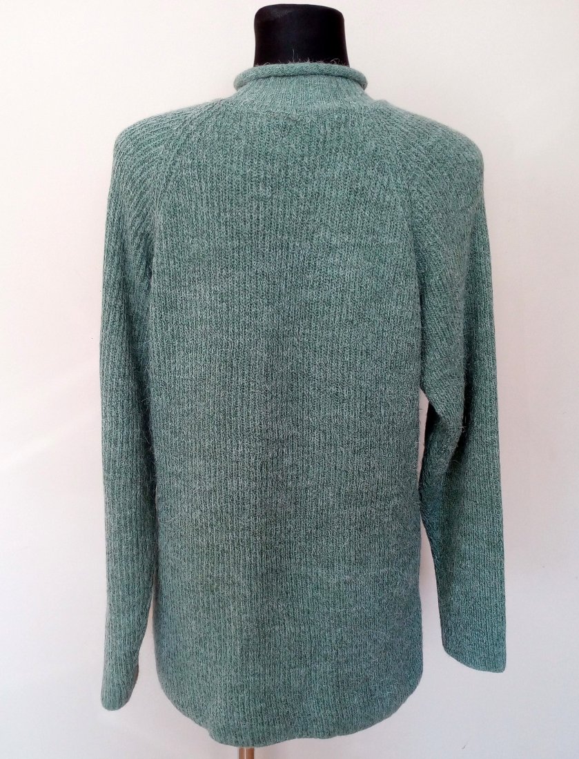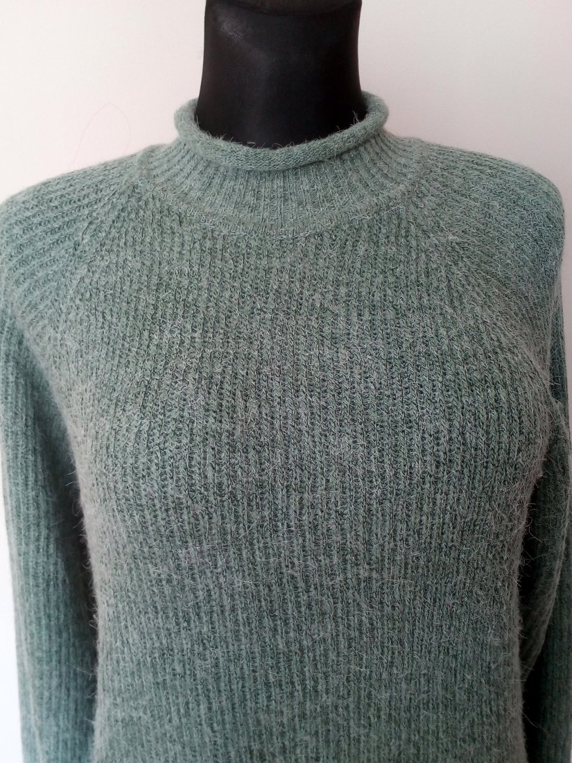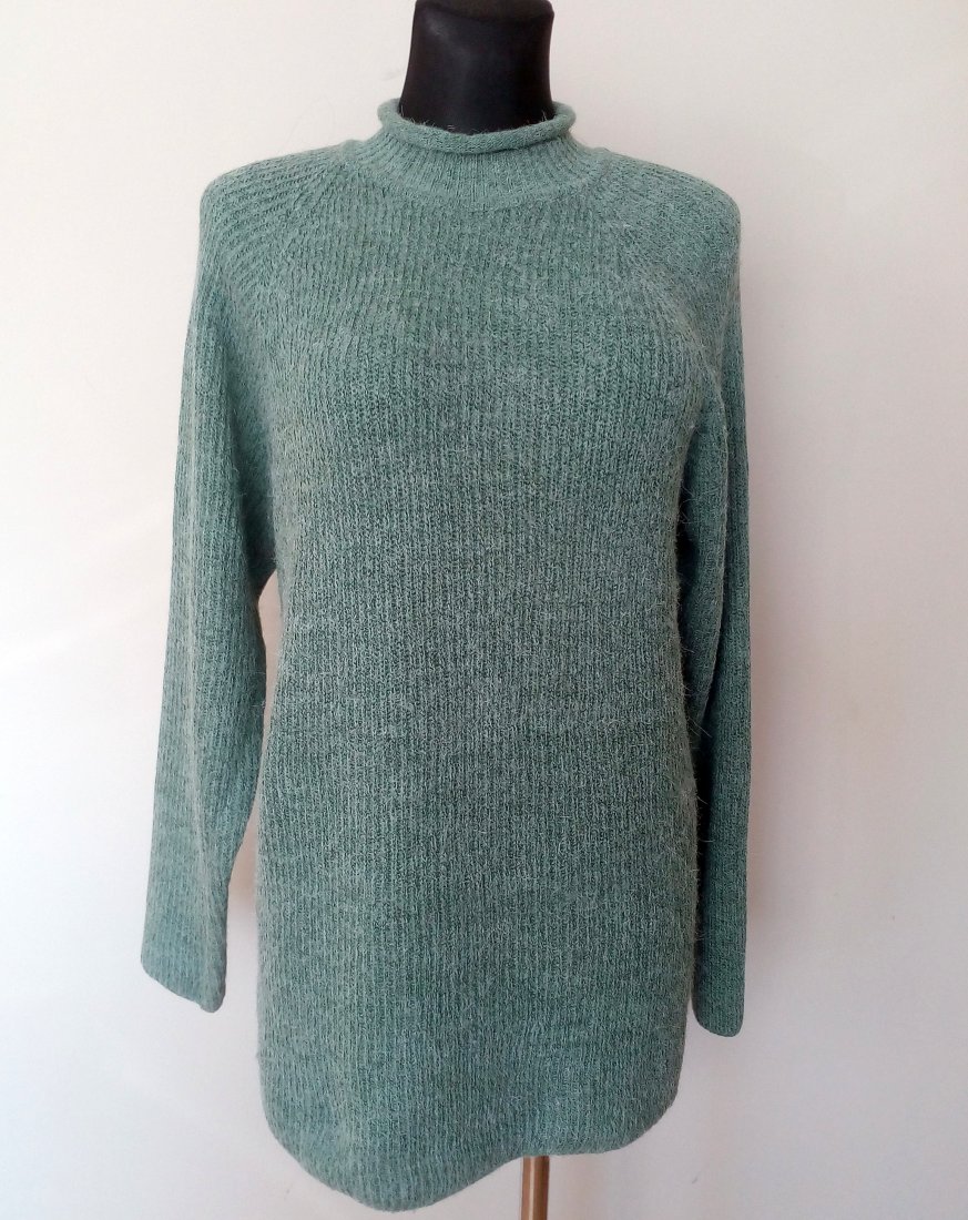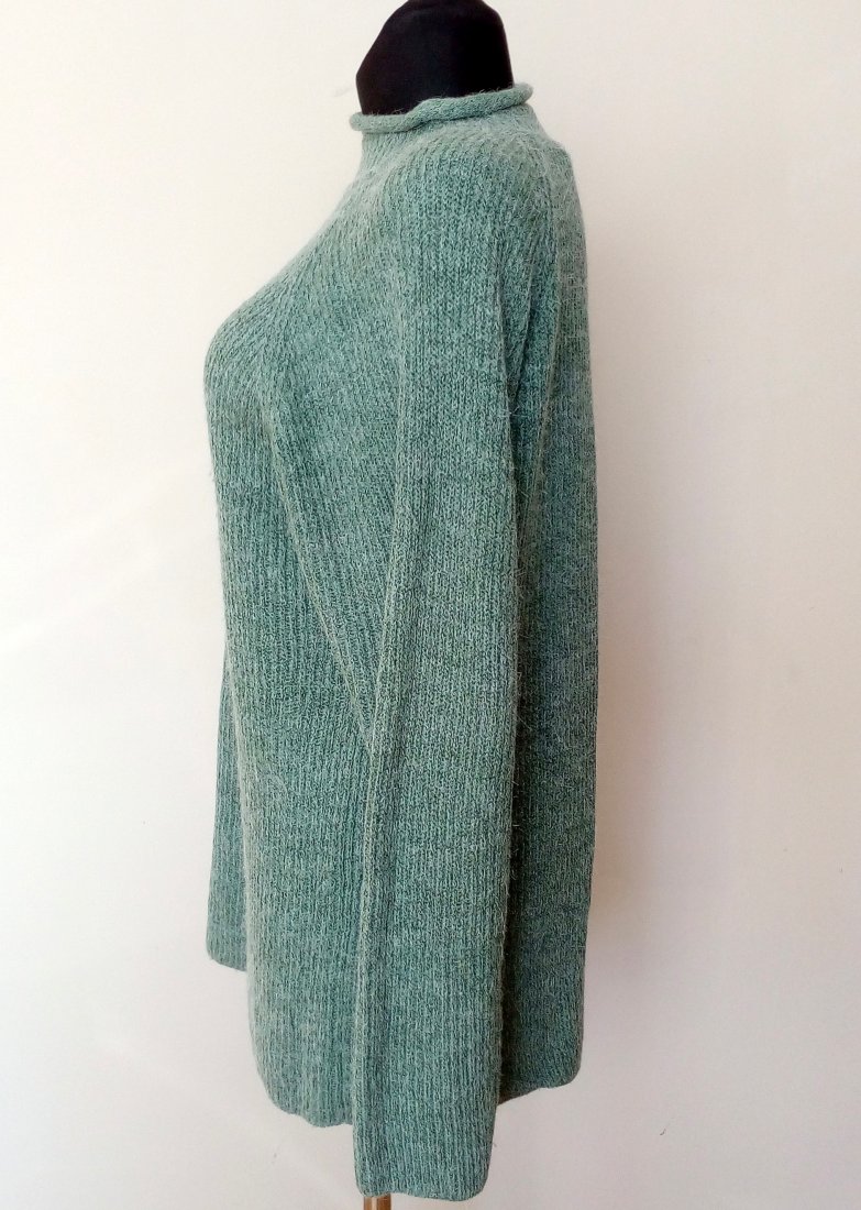 Długi półgolf wykonany ściegiem angielskim, rękawy raglanowe, kolor melanżowy - ciemna mięta z delikatną czarną nitką