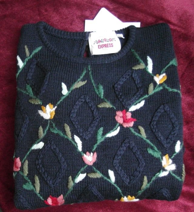 Granatowy z kolorowymi haftowanymi kwiatami. Jeżeli sweter może być elegancki, to ten jest. Święta w górach...