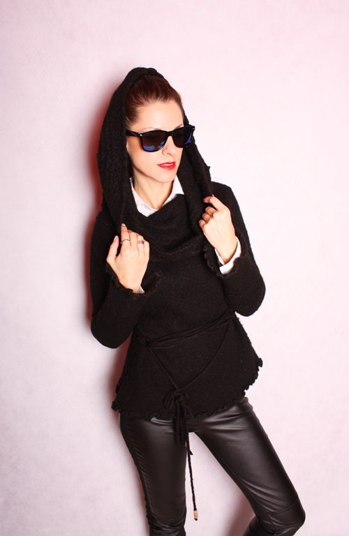 Czarny sweterek z obszernym golfem,,z przodu ozdobne sznureczki