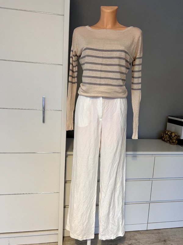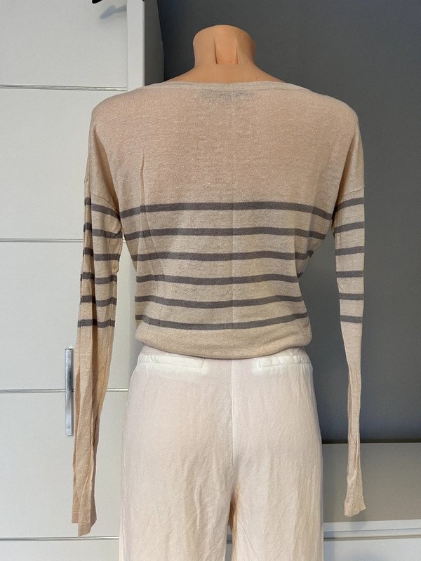 Delikatny, cieniutki sweterek firmy premium Birger et Mikkelsen Woman. Kolor beżowy w czarne, poziome modne paseczki. Rozmiar określam jako S/M ale proszę sugerować się wymiarami. Sweterek posiada małą plamkę, myślę, że zejdzie w praniu, pokazaną na dwóch ostatnich zdjęciach. Metkę ze składem wycięłam bo przebijała, o ile pamiętam jest to wiskoza dlatego sweterek jest przewiewny. Polecam