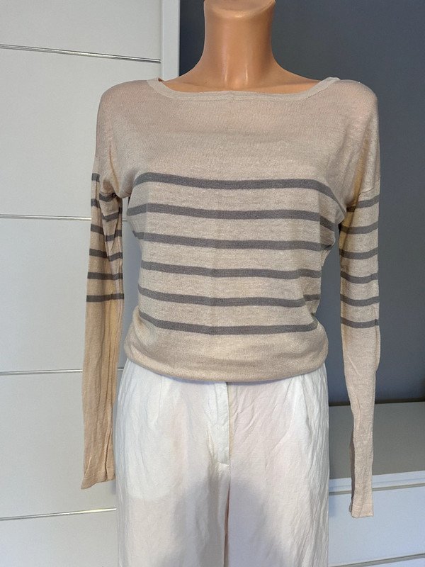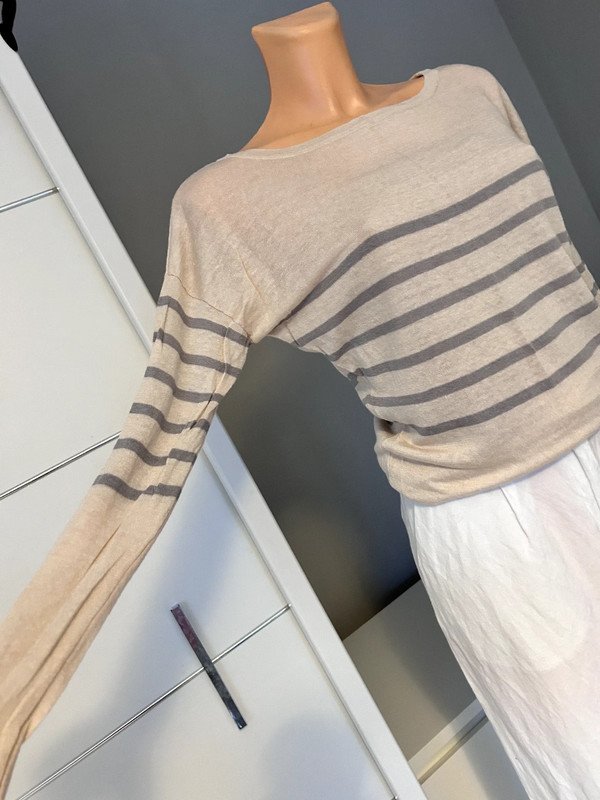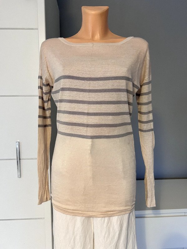 Delikatny, cieniutki sweterek firmy premium Birger et Mikkelsen Woman. Kolor beżowy w czarne, poziome modne paseczki. Rozmiar określam jako S/M ale proszę sugerować się wymiarami. Sweterek posiada małą plamkę, myślę, że zejdzie w praniu, pokazaną na dwóch ostatnich zdjęciach. Metkę ze składem wycięłam bo przebijała, o ile pamiętam jest to wiskoza dlatego sweterek jest przewiewny. Polecam