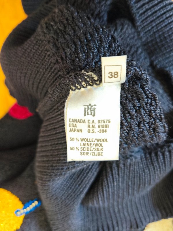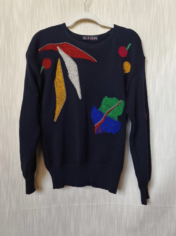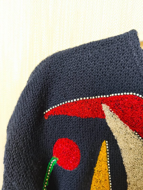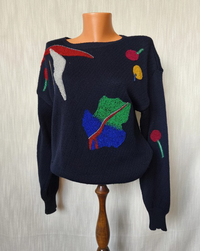 Czarny sweter wykonany z mieszanki wełny i jedwabiu. Na swetrze ozdobne kolorowe hafty. Zakończony ściągaczem, co pozwala na noszenie w różny sposób. Rzadki egzemplarz.