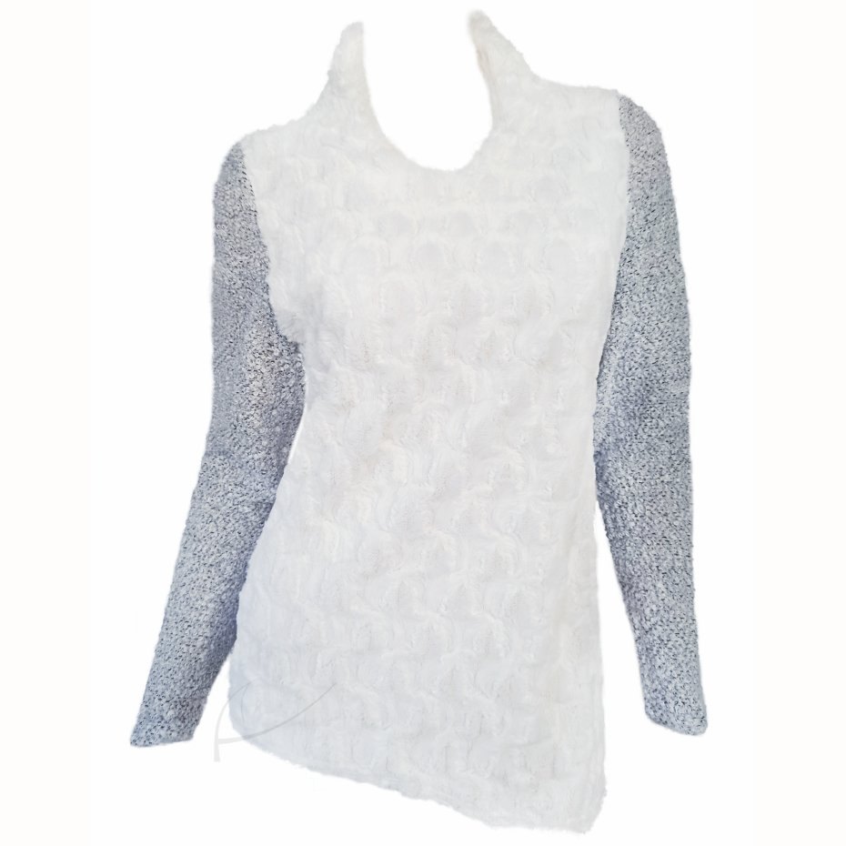 Projekt: sweter z podwyższoną linią karku, dekolt w serek. Rękawy z dzianiny biało- szarej bouckle.