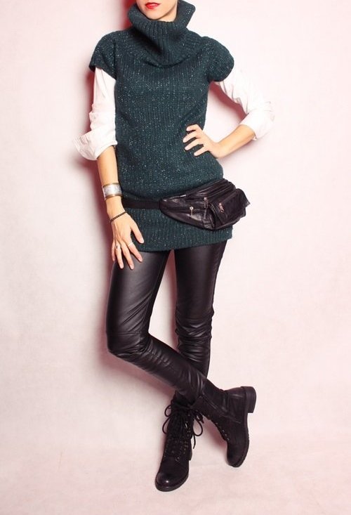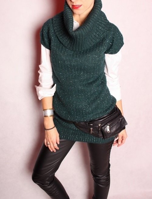 Zielony sweterek z szerokim golfem.