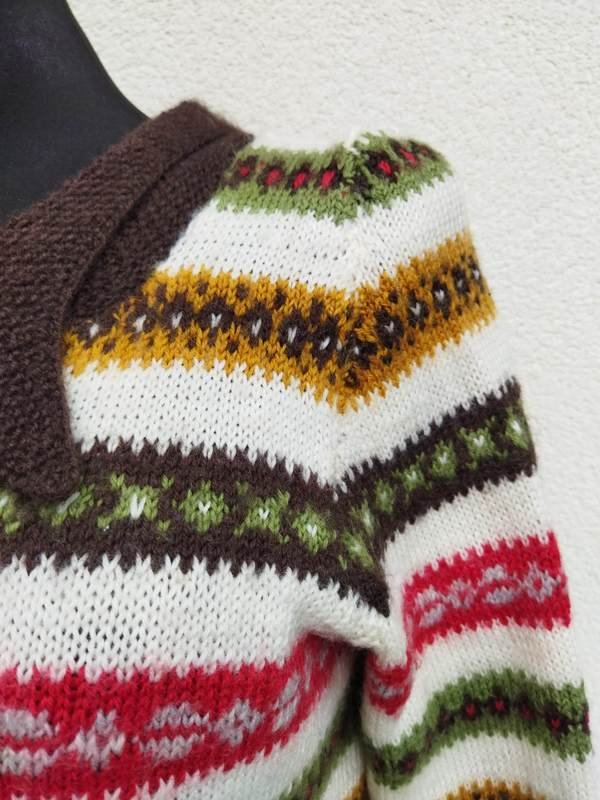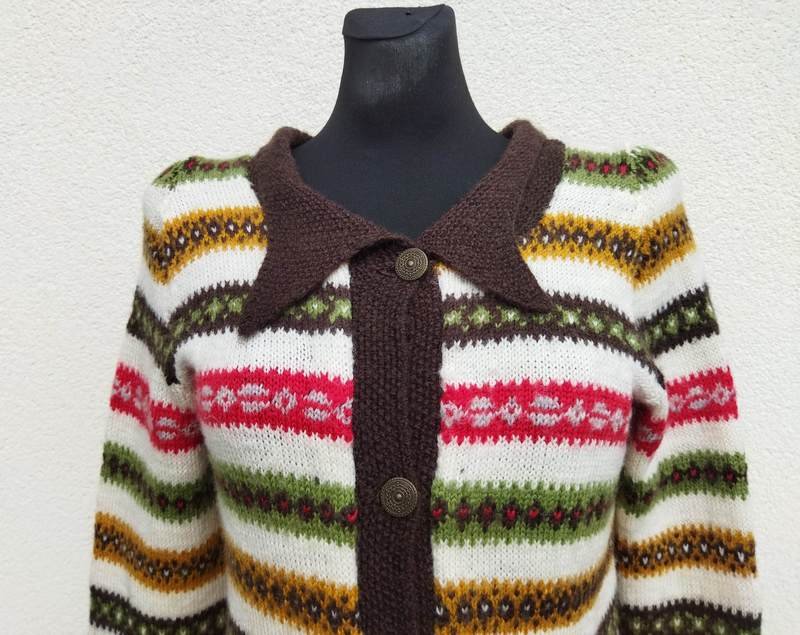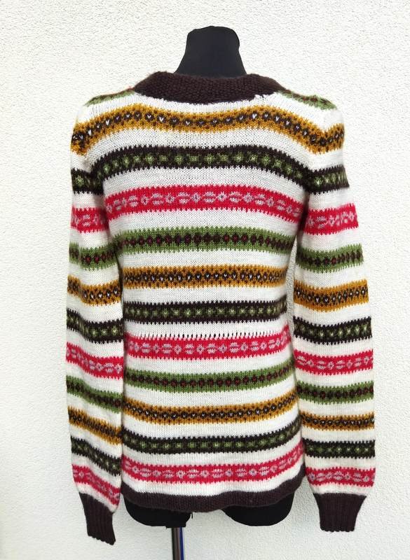 Rozpinany sweter dziergany na drutach we wzorzyste paski na tle w mlecznej bieli,  z wykończeniem w kolorze gorzkiej czekolady. z kołnierzykiem , zapinany na metalowe grawerowane guziki. Kolorystyka ; ciemny brąz, oliwkowa zieleń , czerwień, gołębi błękit i ochra.