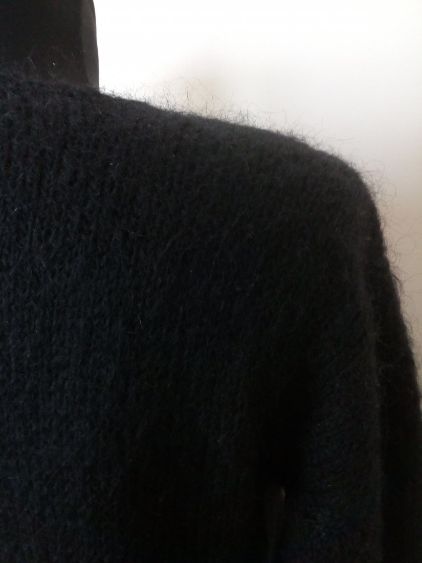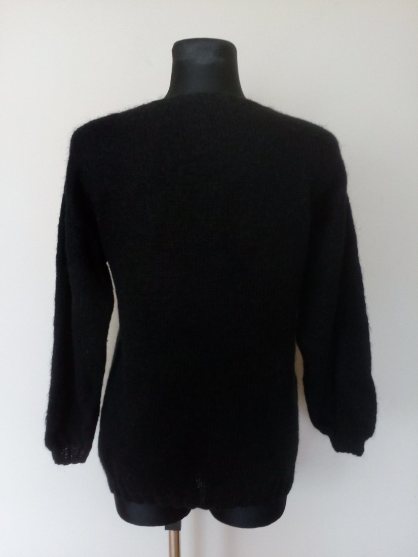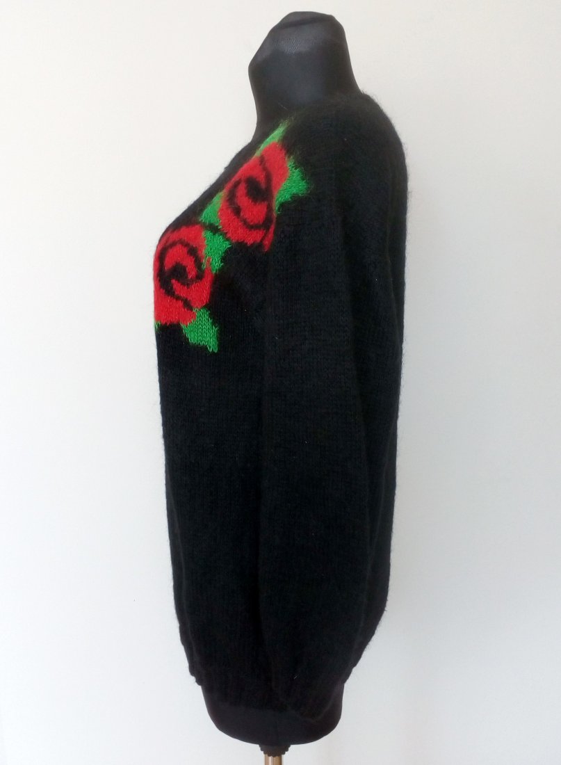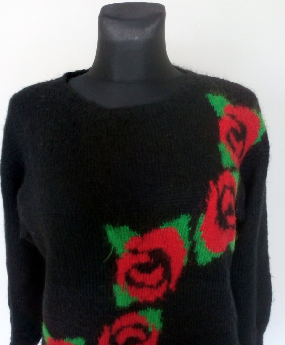 Czarny sweter ze wzorem róż na przodzie, dekolt okrągły z plisą, rękaw obniżany, ściągzcz u dołu i przy rękawach