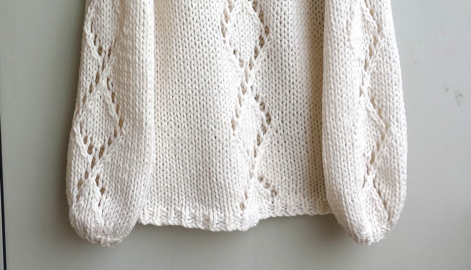Sweter z ażurowym wzorem handmade. Z tyłu wzór jest taki sam jak z przodu. Kolor: kremowy.