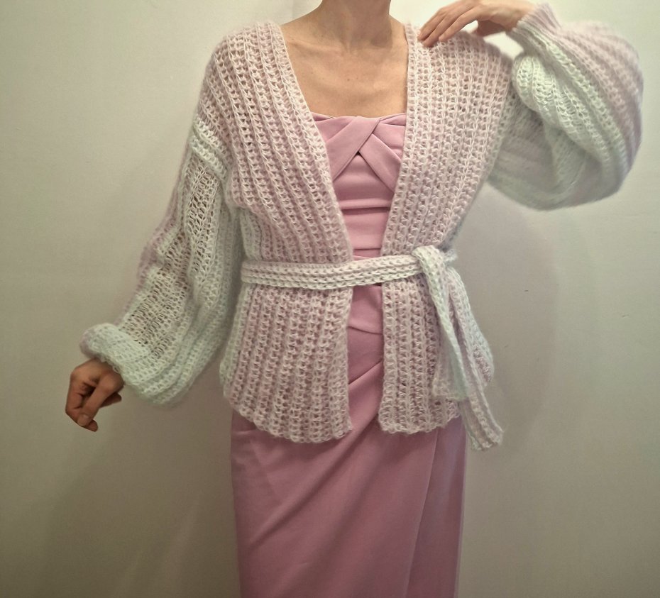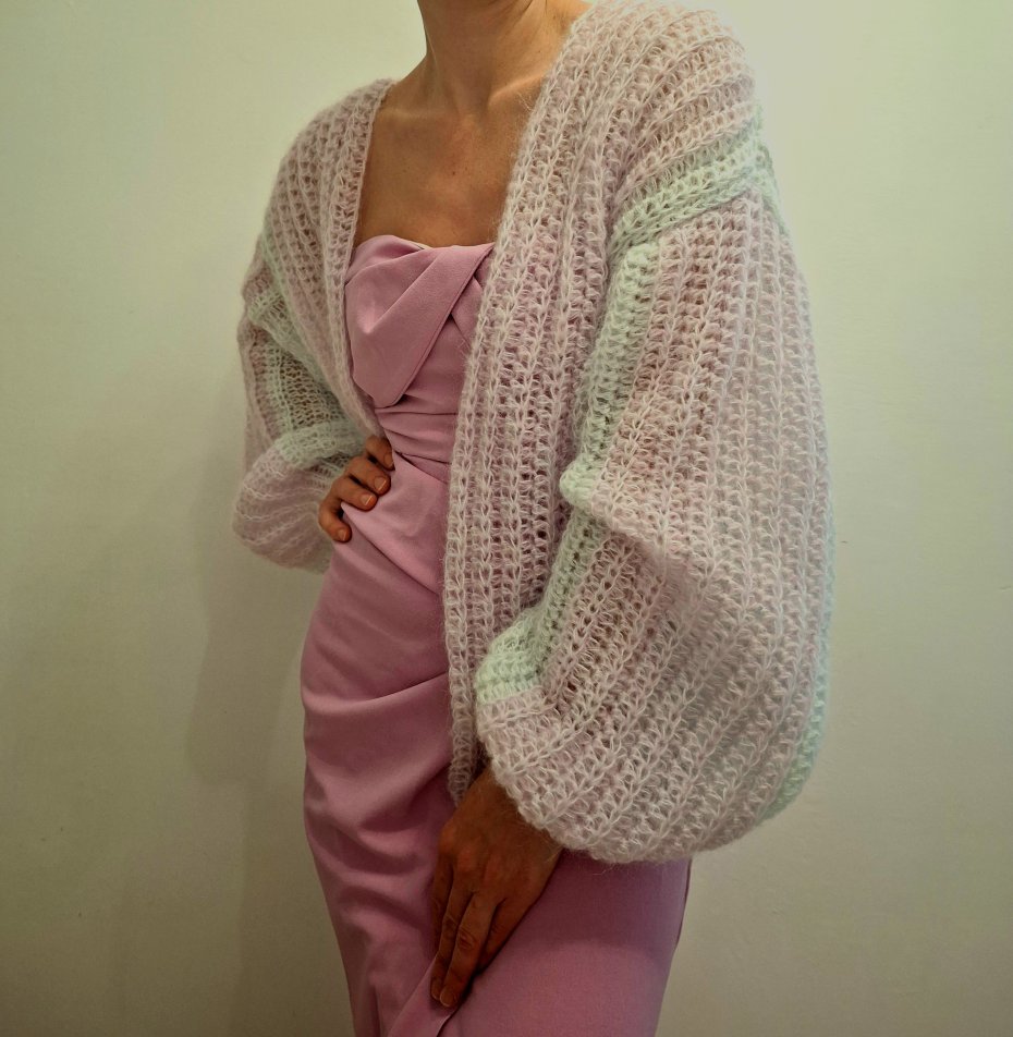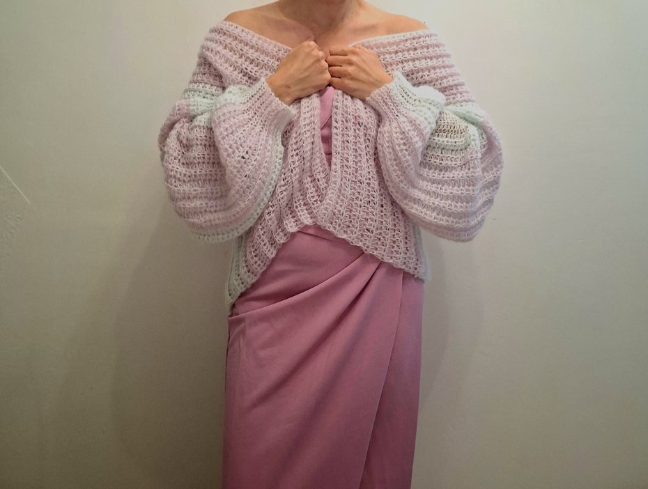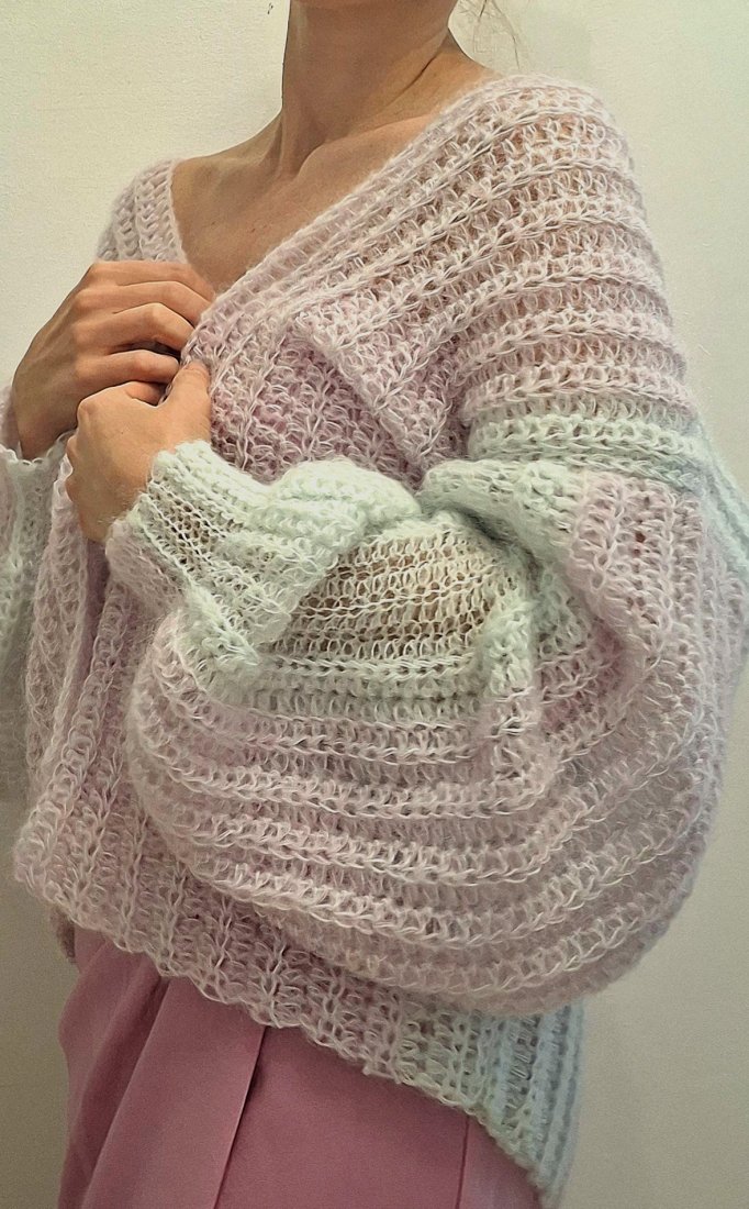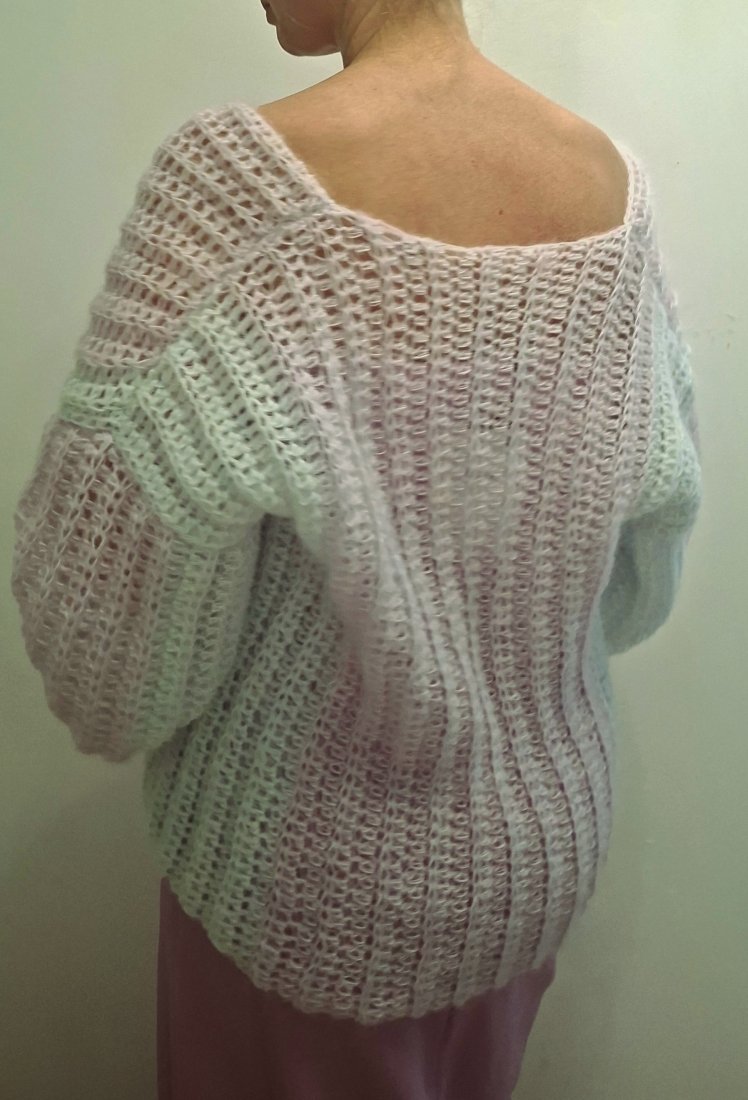 Ręcznie robiony sweter wykonany z delikatnego moheru w pastelowych odcieniach. Niezwykle miękki, lekki i puszysty, przyjemny w dotyku. Luźny fason oversize pięknie układa się na sylwetce i daje możliwość noszenia klasycznie lub opuszczonego na ramiona.