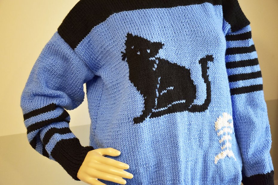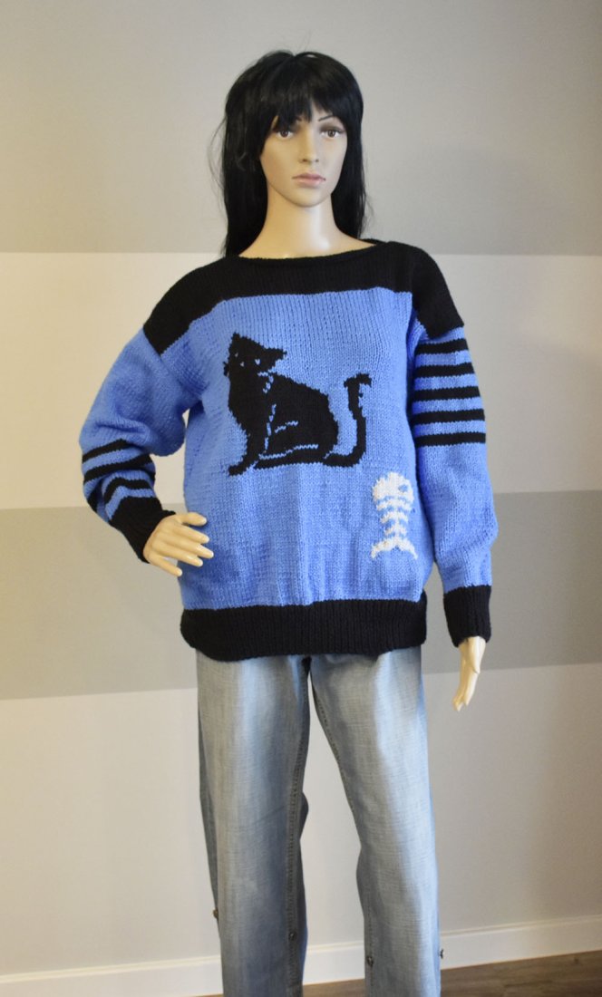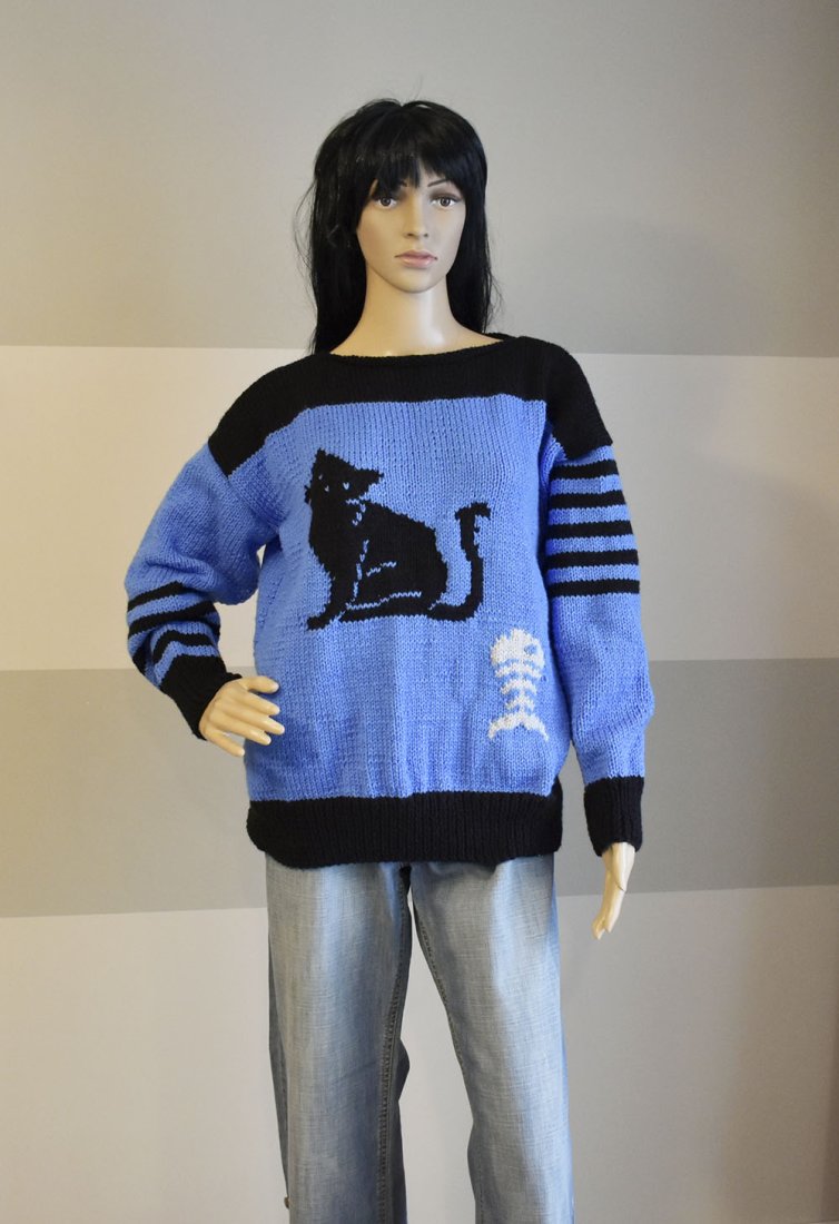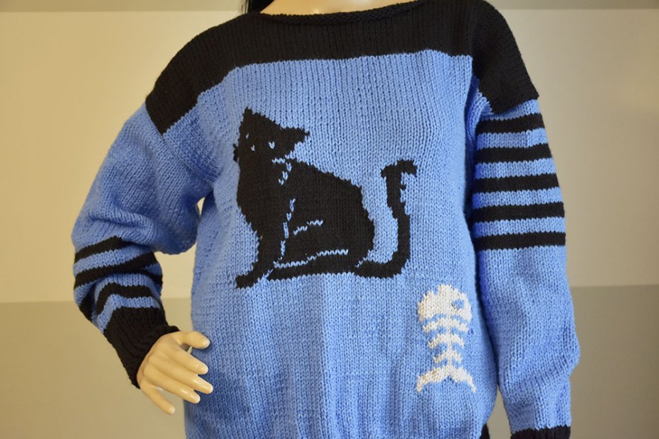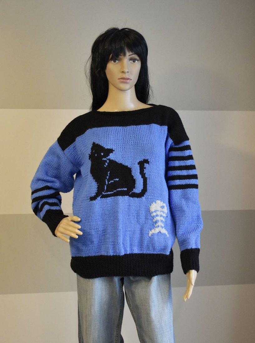 Oryginalny sweter handmade w niebiesko-czarnej kolorystyce z graficznym motywem kota i rybiej ości.