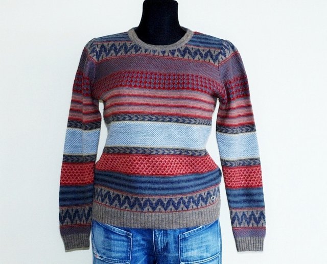 Sweter niemieckiej firmy Lisa Tossa. Dużo się tutaj dzieje, każdy pas to inny wzór i kolor. Kolory piękne, przygaszone. Na dole metalowa blaszka z logo firmy. Cena sklepowa takich swetrów to 30-50 euro.