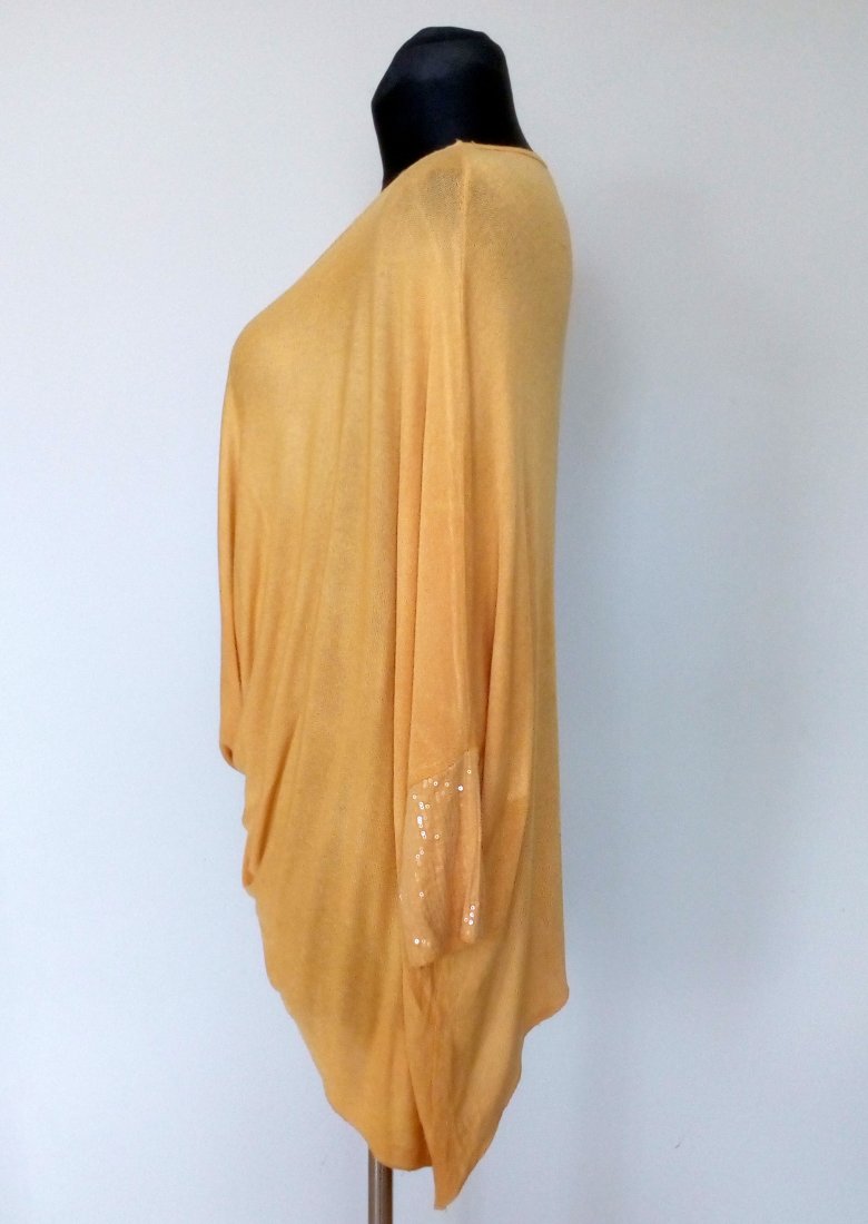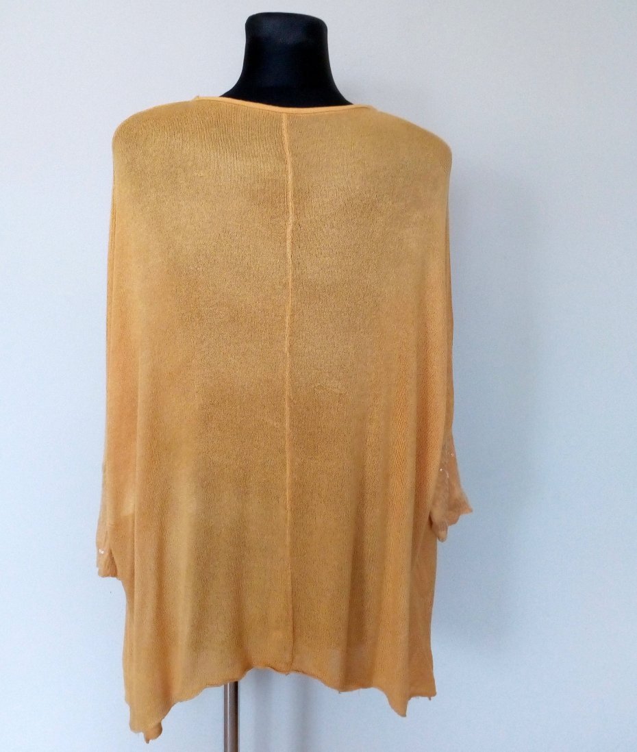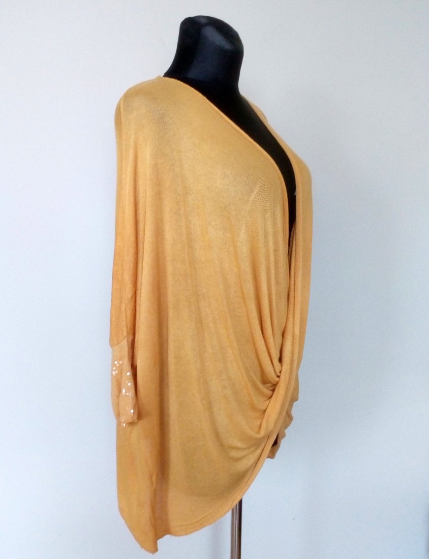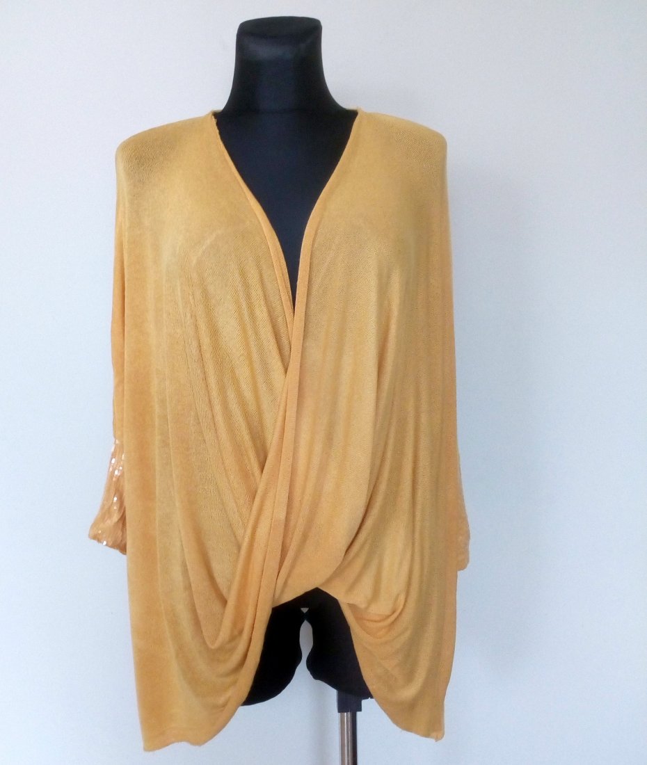 cienki sweter/narzutka w żółtym kolorze, fason typu nietoperz, doszywane krótkie rękawy z transparentnymi cekinami, po zalożenie dłuższy po bokach