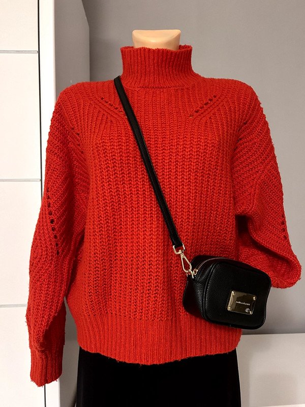 Czerwony klasyczny sweter półgolf, stójka marki Pieces w rozmiarze S, oversizowy będzie pasował też na rozmiar M. Gruby splot, ażurowy, ciepły. Szafa kapsułowa, old many.
