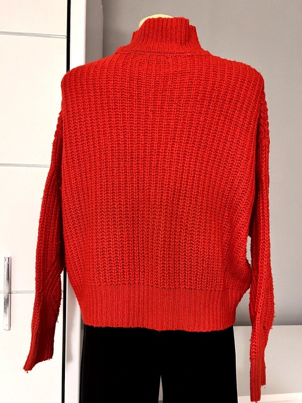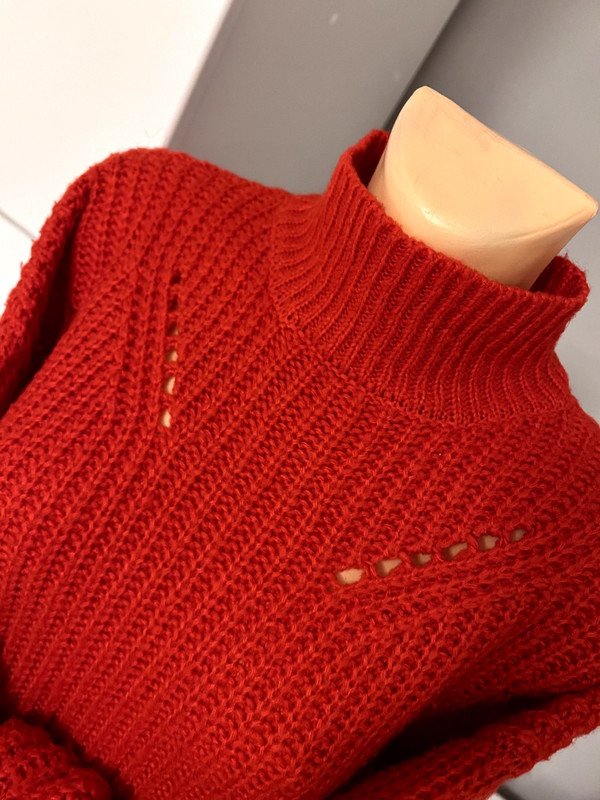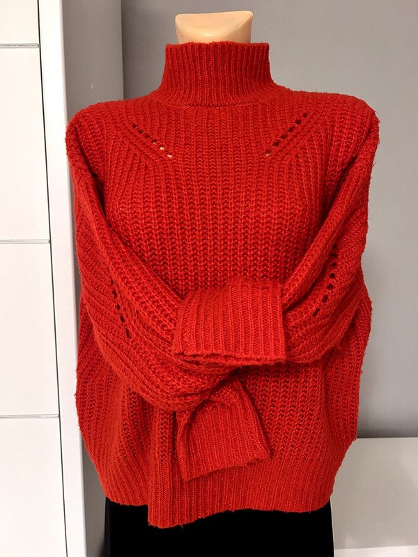 Czerwony klasyczny sweter półgolf, stójka marki Pieces w rozmiarze S, oversizowy będzie pasował też na rozmiar M. Gruby splot, ażurowy, ciepły. Szafa kapsułowa, old many.