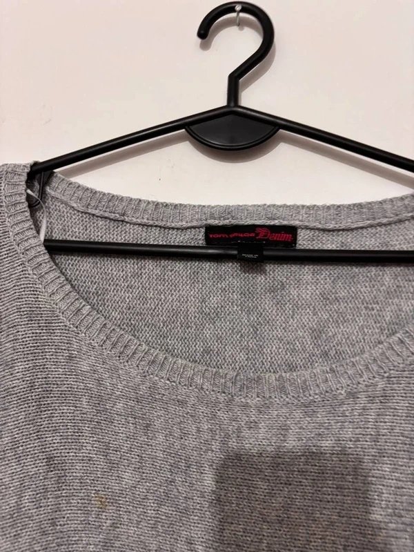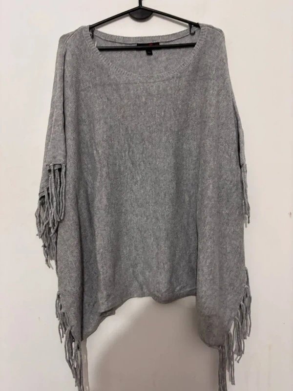 Miękki, lekki i bardzo wygodny sweter–ponczo TOM TAILOR Denim w odcieniu jasnoszarym. Model z dekoracyjnymi frędzlami po bokach, luźnym krojem i miękką dzianiną. Idealny na co dzień, do legginsów, dżinsów lub jako narzutka.