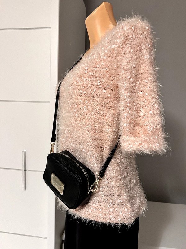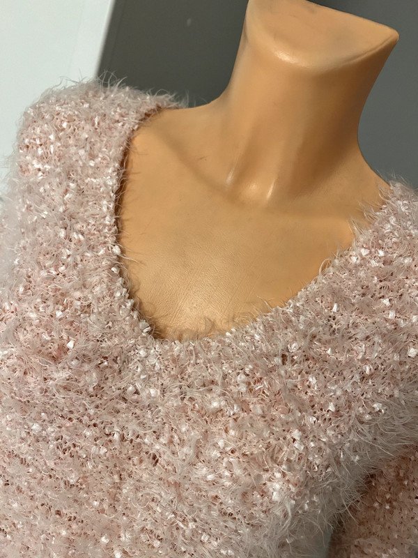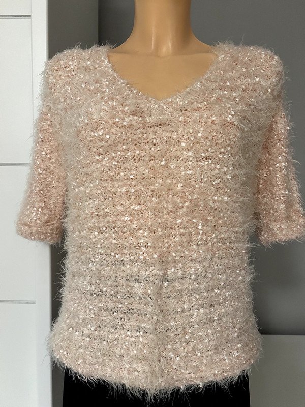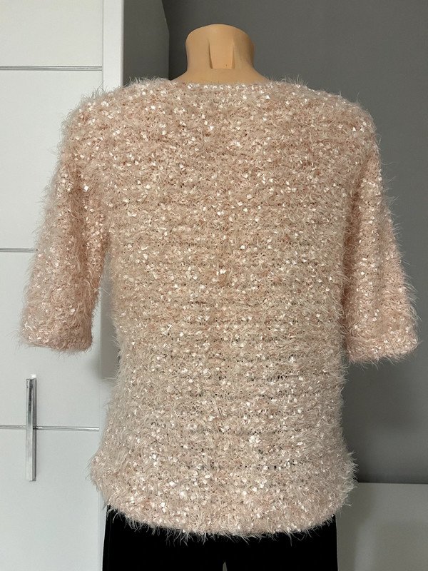Piękny sweterek w rozmirze xs nude pudrowy róż, łososiowy F&F. Puchaty, z mieniącą się nitką, bardzo elastyczny, bardzo kobiecy fason, klasyczny. Krótki rękaw, old many style, szafa kapsułowa