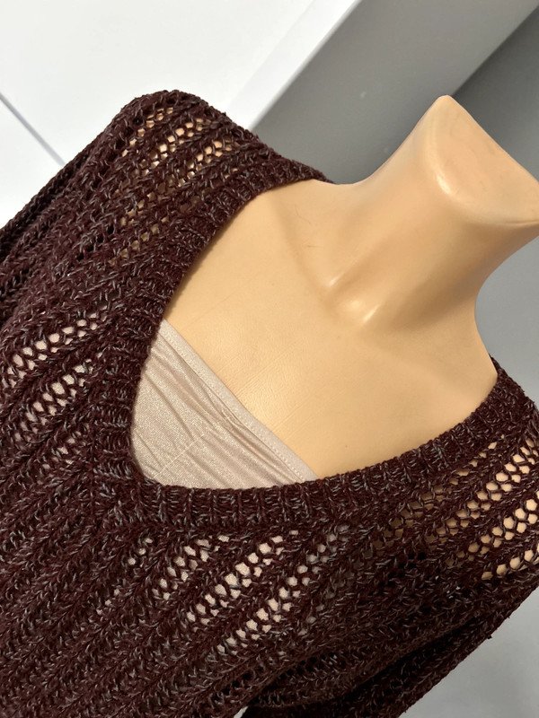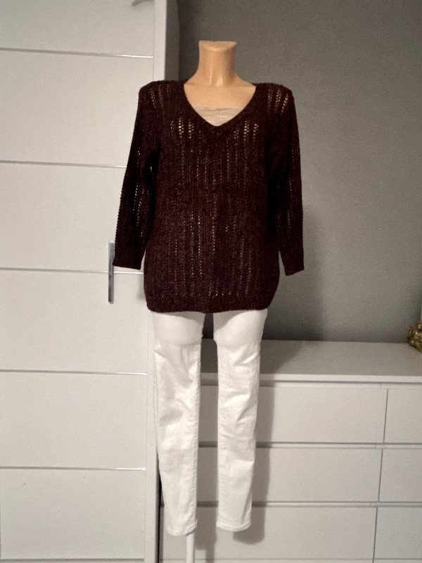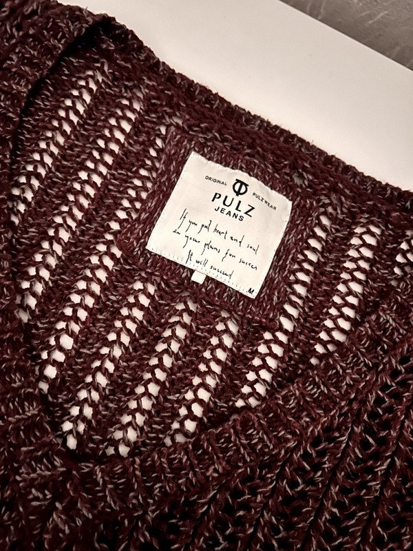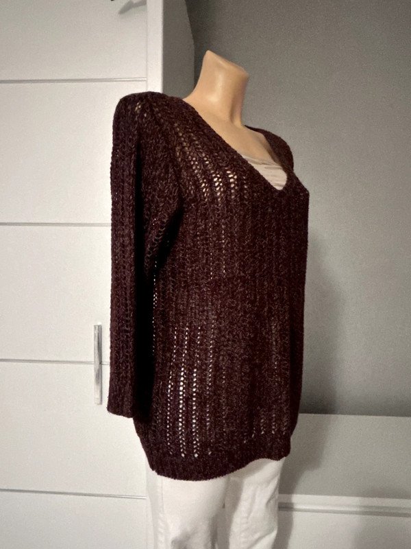 Sweter firmy Pulz w rozmiarze M 38. Kolor ciemny bordowy, dekolt v, ozdobne pionowe mereżki.