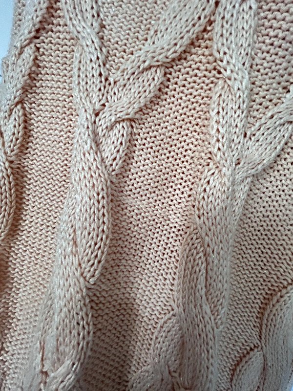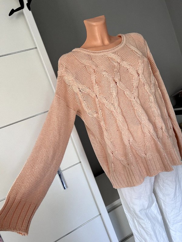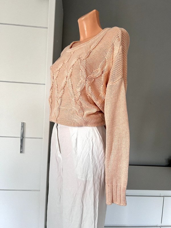 Sweter firmy Reserved, rozmiar M 38. Kolor łososiowy z warkoczami. Na ostatnim zdjęciu pokazane lekkie zaciągnięcie. Polecam