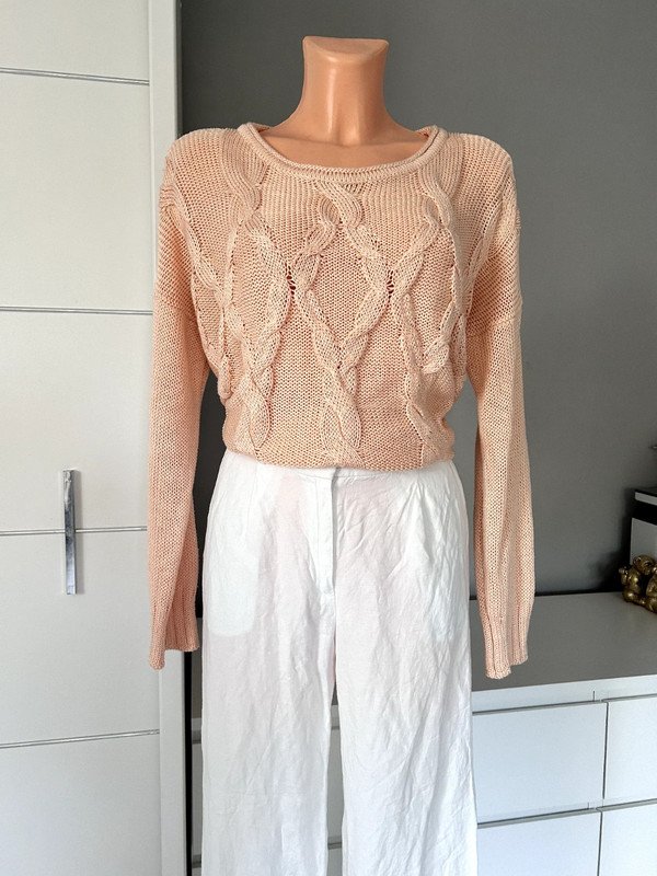 Sweter firmy Reserved, rozmiar M 38. Kolor łososiowy z warkoczami. Na ostatnim zdjęciu pokazane lekkie zaciągnięcie. Polecam