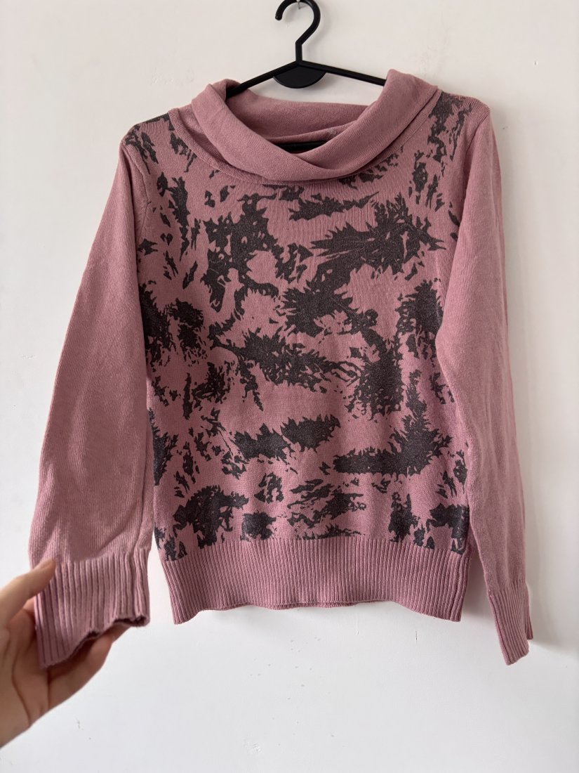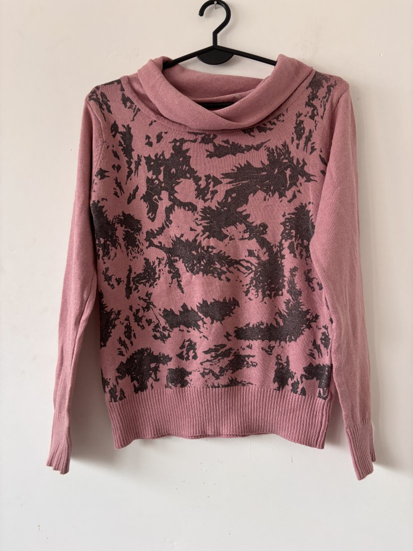 Miękki różowy sweter z efektownym czarnym, malarskim wzorem z przodu. Model z wygodnym, lekko opadającym kołnierzem, który nadaje całości elegancki i nietuzinkowy charakter. Rękawy i dół zakończone elastycznym ściągaczem.