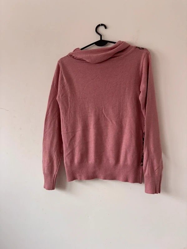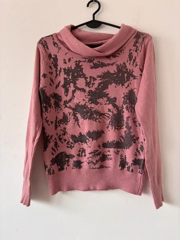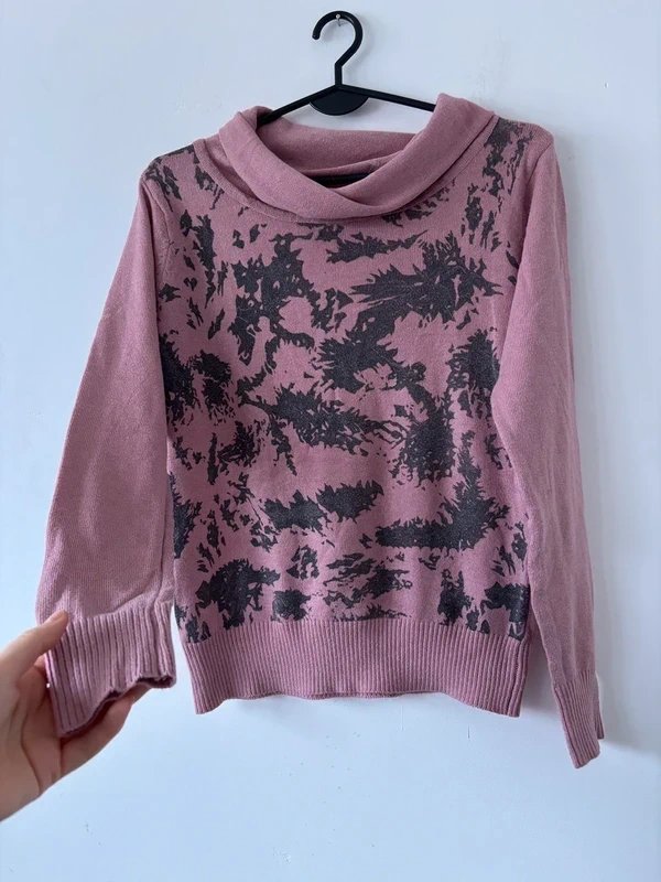 Miękki różowy sweter z efektownym czarnym, malarskim wzorem z przodu. Model z wygodnym, lekko opadającym kołnierzem. Rękawy i dół zakończone elastycznym ściągaczem.