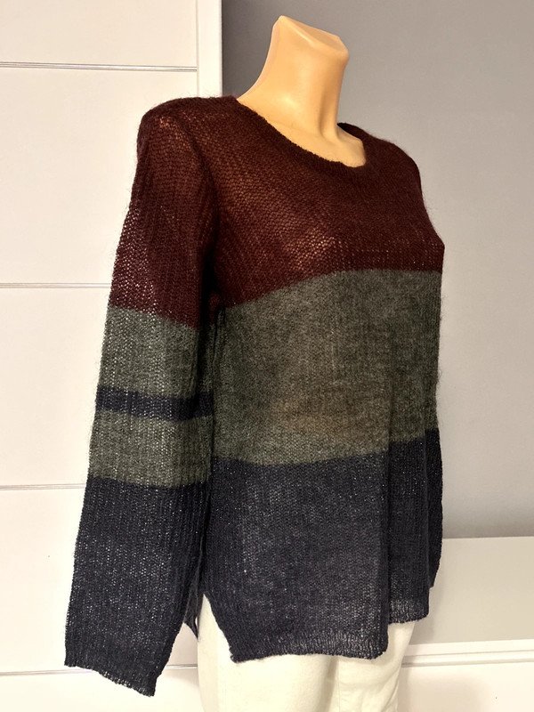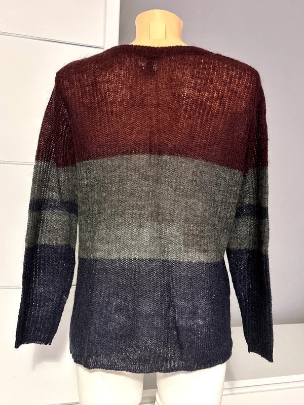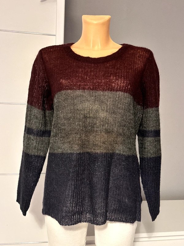 Sweter firmy Saint Tropez r. XS 34. Cieniutki i delikatny ale ciepły. Wycięta metka ze składem, ponieważ prześwitywała ale to 50 % wełna. Kolor bordowe szare grafitowe pasy.