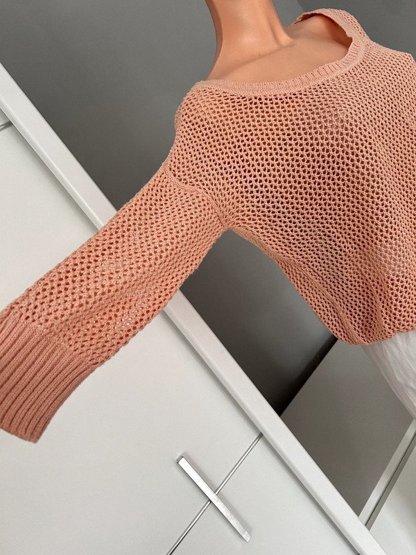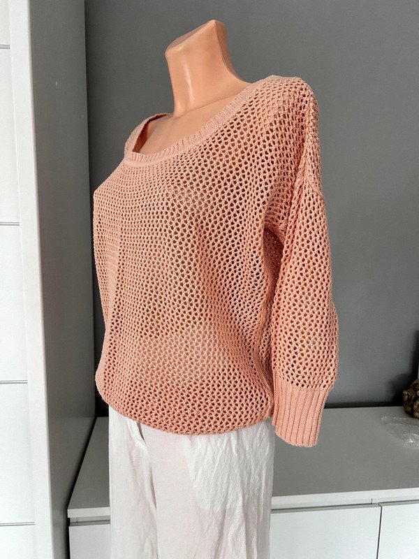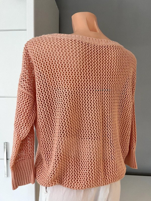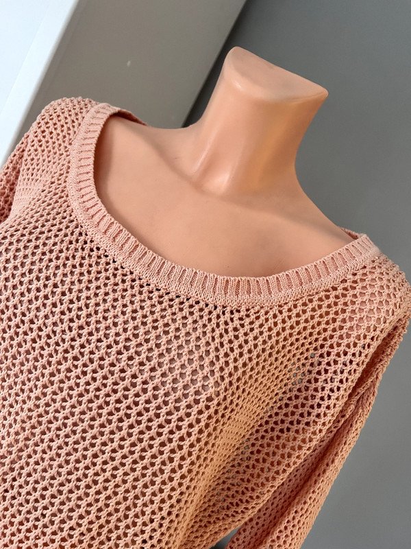 Sweter siateczkowy, kolor łososiowy. Rozmiar określam jako S/M ale proszę sugerować się wymiarami na zdjęciach. Bawełna 50 %, a więc przewiewny. Polecam