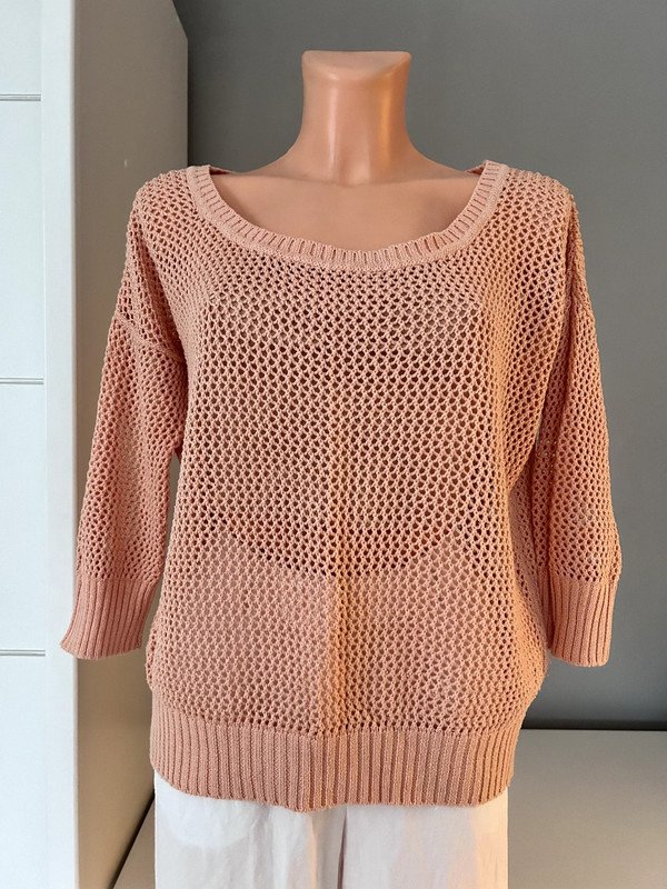 Sweter siateczkowy, kolor łososiowy. Rozmiar określam jako S/M ale proszę sugerować się wymiarami na zdjęciach. Bawełna 50 %, a więc przewiewny. Polecam