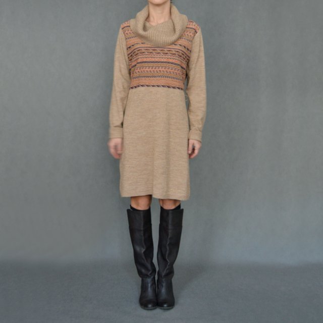 Bardzo fajny sweter sukienka z wzorem i golfem. W camelowym kolorze. Posiada szlufki, więc można nosić z paskiem. Marka DUNNES.