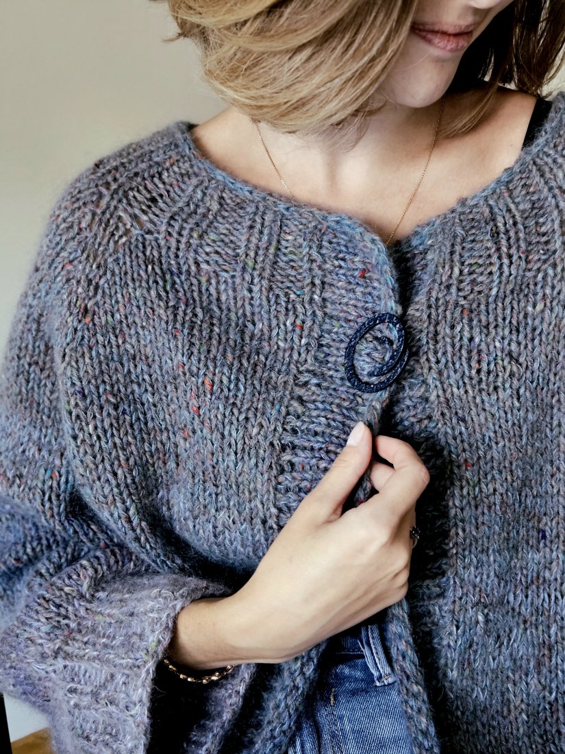 Wyjątkowy sweter wykonany ręcznie na drutach z miękkiej, tweedowej włoczki z merynosa połączonej z moherem i jedwabiem.