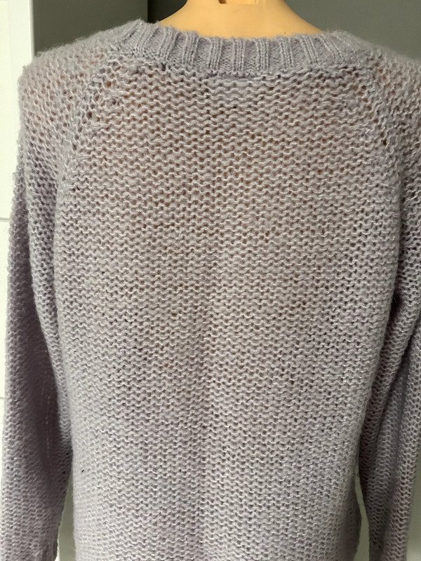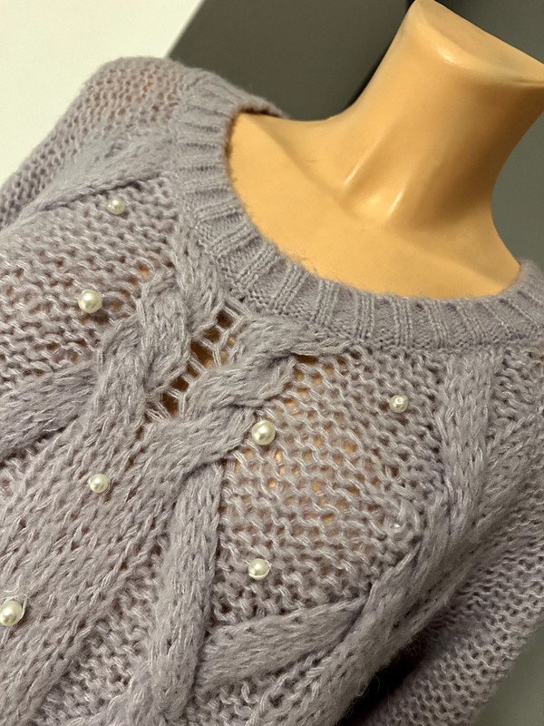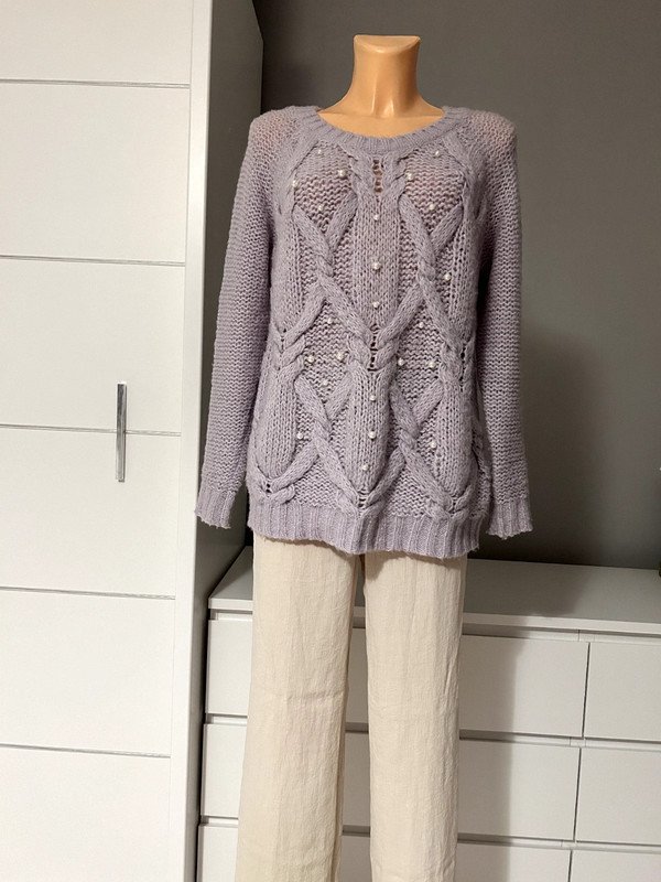 Sweter z alpaką i wełną w składzie, Vila, r. XS ale pasuje również na S i M, modny liliowy kolor, warkoczowy wzór z przodu z ozdobnymi perełkami.