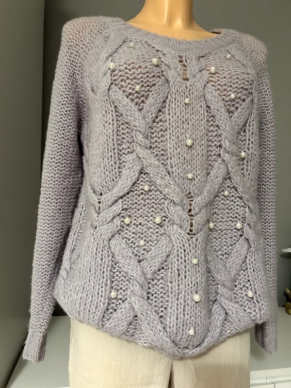 Sweter z alpaką i wełną w składzie, Vila, r. XS ale pasuje również na S i M, modny liliowy kolor, warkoczowy wzór z przodu z ozdobnymi perełkami.