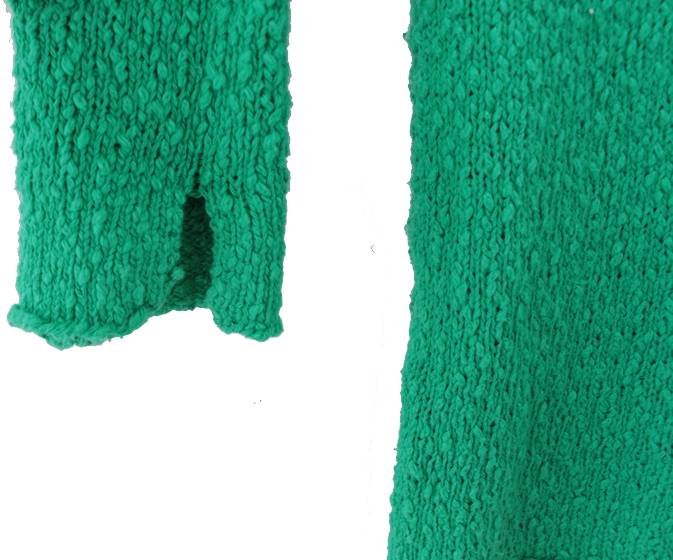 Dekolt typu łódka. Rękaw 3/4 z delikatnymi rozcięciami na dole.