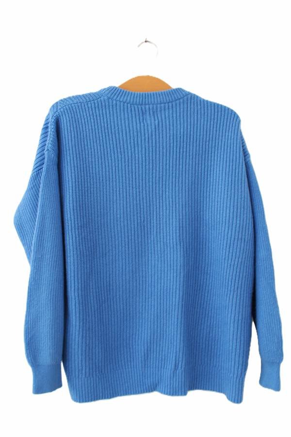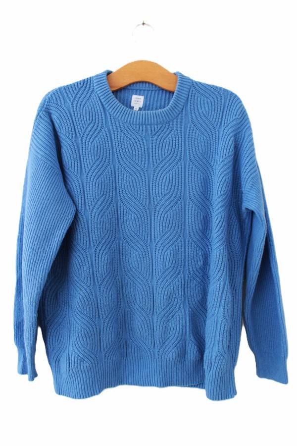 Niebieski sweter o ciekawej strukturze.