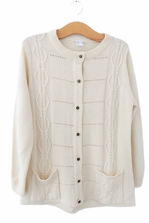 Kremowy kardigan vintage o ciekawej fakturze, z ozdobnymi guzikami. Bardzo dobry skład z przewagą wełny i bawełny.
