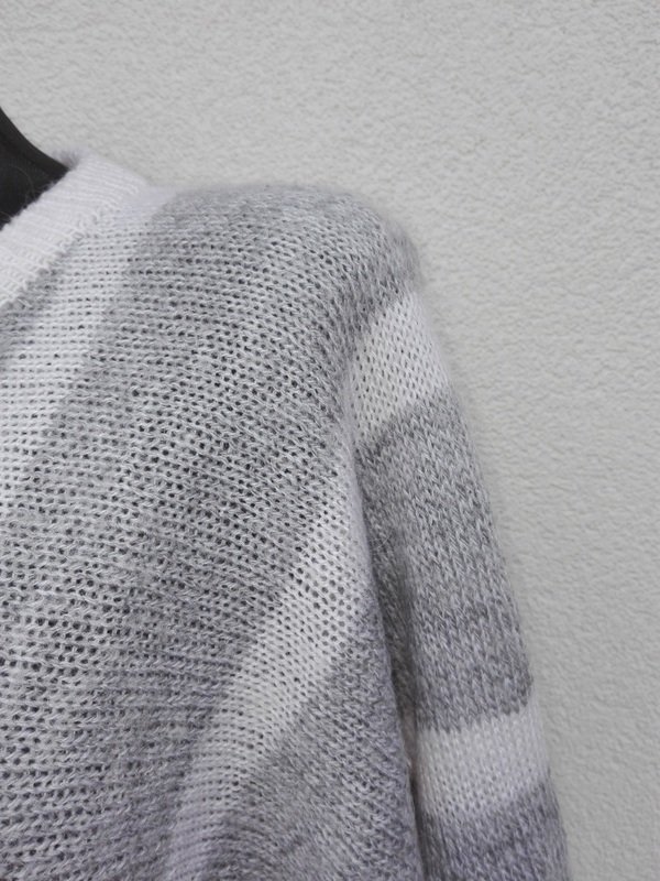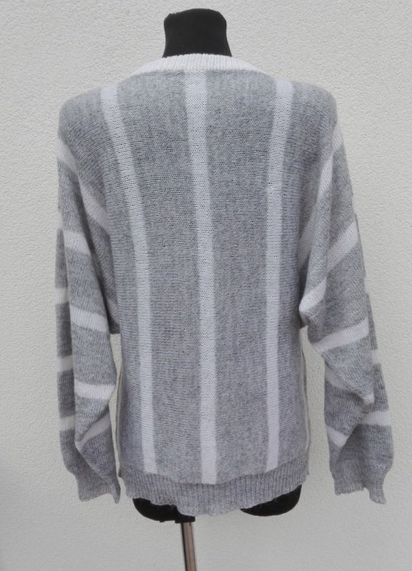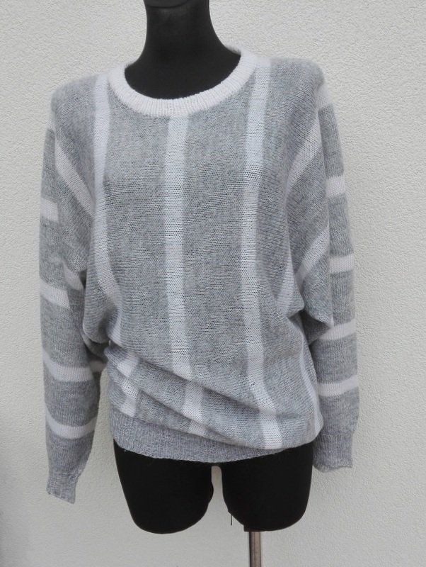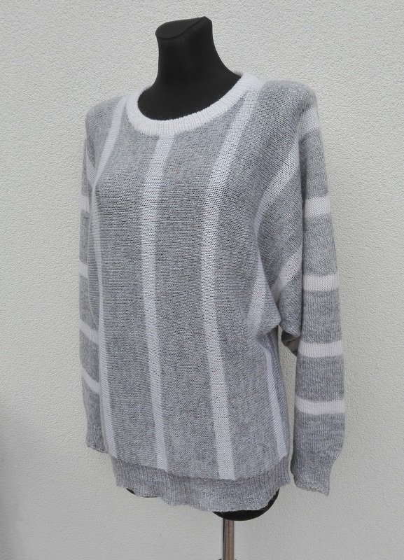 Sweter w paski w szaro - białej kolorystyce, z owalnym dekoltem. Rękawy o fasonie nietoperza bez szwów ramiennych. Wykończony ściągaczami.
