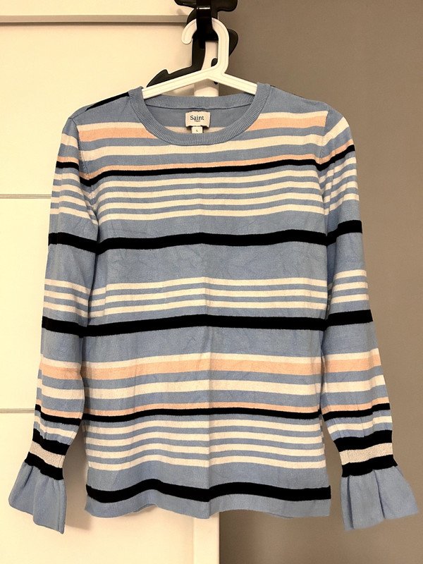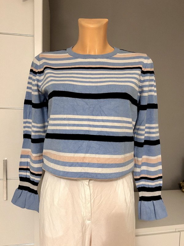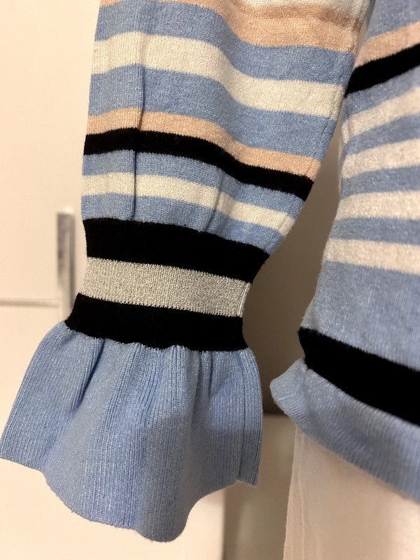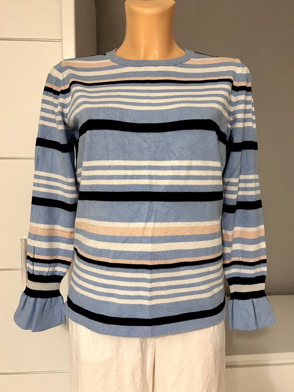 Sweter renomowanej marki Saint Tropez. Rozmiar z metki to L 40. Posiada piękne falbanki na końcu rękawów.