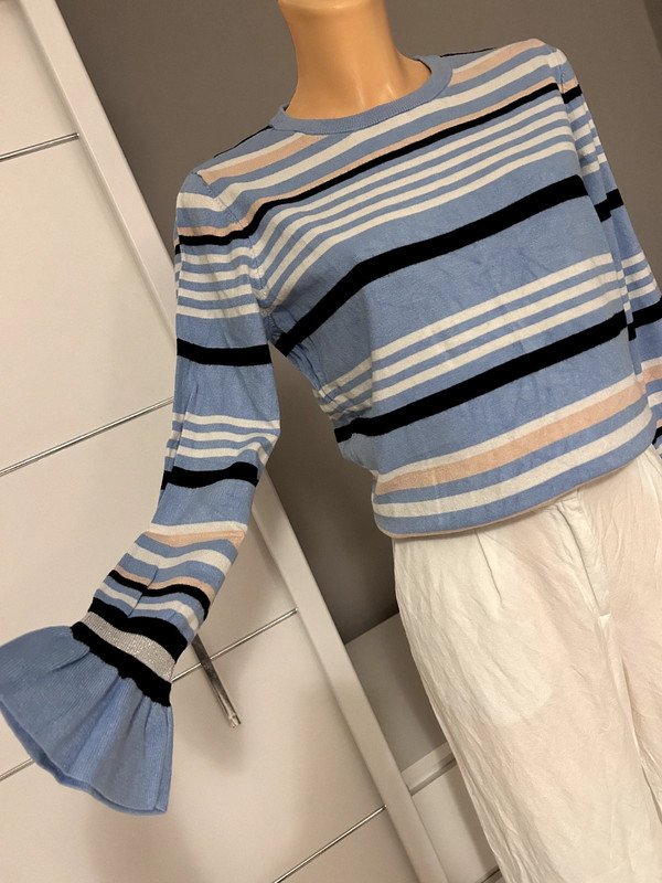 Sweter renomowanej marki Saint Tropez. Rozmiar z metki to L 40. Posiada piękne falbanki na końcu rękawów.